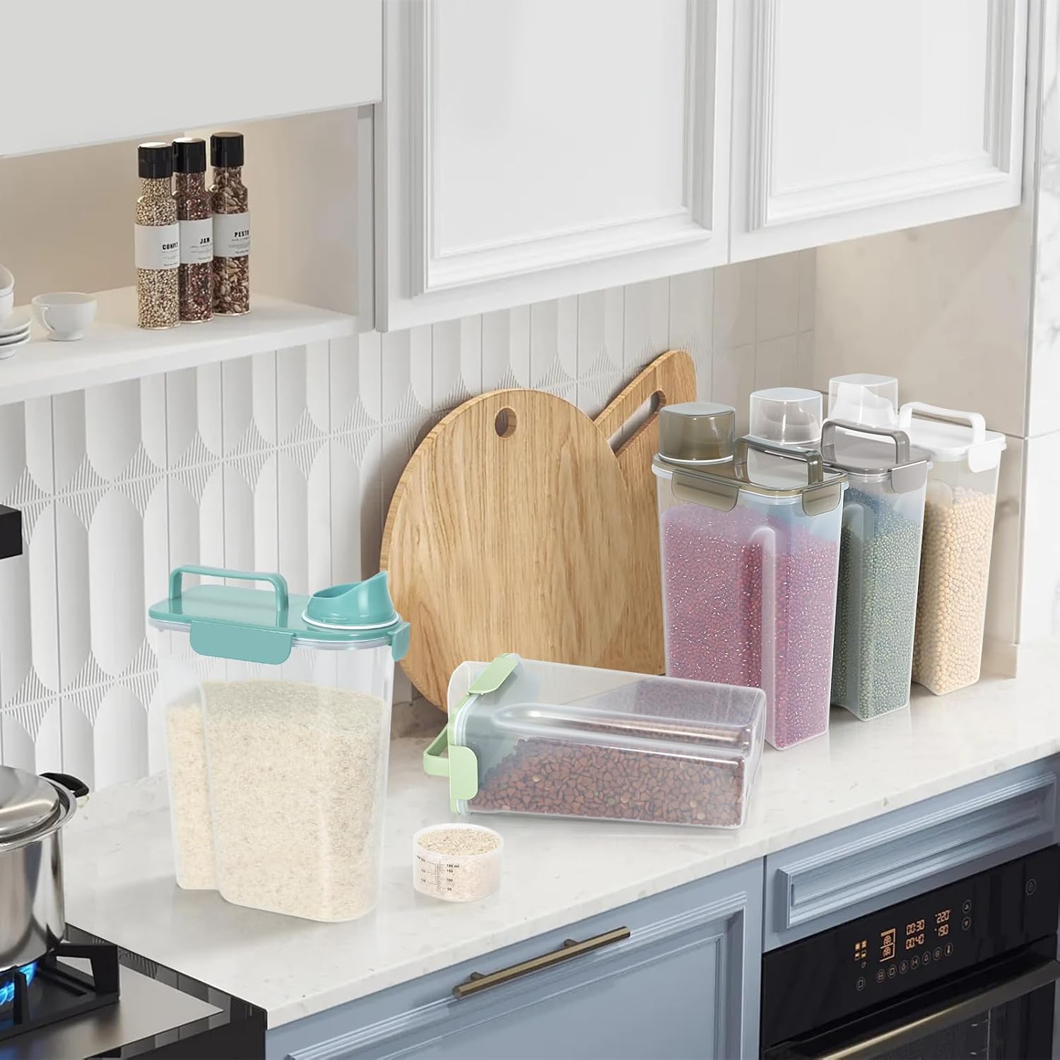 • MULTI-PURPOSE STORAGE : Our pet food container is suitable for storing dog food、cat food、bird seed、fish food、rice、 dry food、cereals、oats、flour and other large and small grains, as well as washing powder used at home. It is also a good choice.