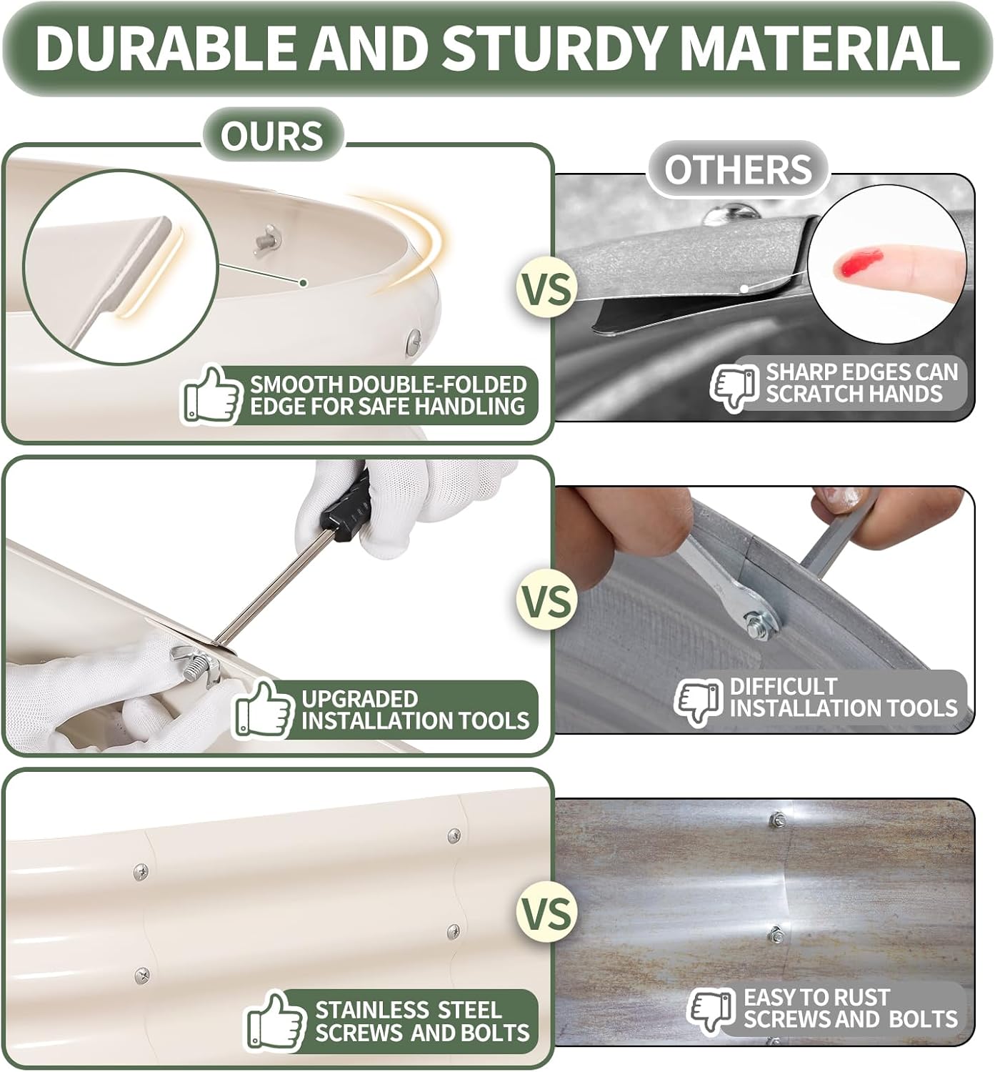 • 【Safety Edge Design & Durable Rubber Strips】The garden bed's top and bottom edges are folded to eliminate sharp edges, ensuring safety from all sides. Rubber strips add extra protection and cushioning, with built-in patches for durability. The galvanized planting box offers the perfect solution for creating your ideal vegetable garden. With the 1More raised bed, enjoy a worry-free gardening experience, prioritizing your safety and convenience. The ultimate choice for a hassle-free and enjoyable gardening experience