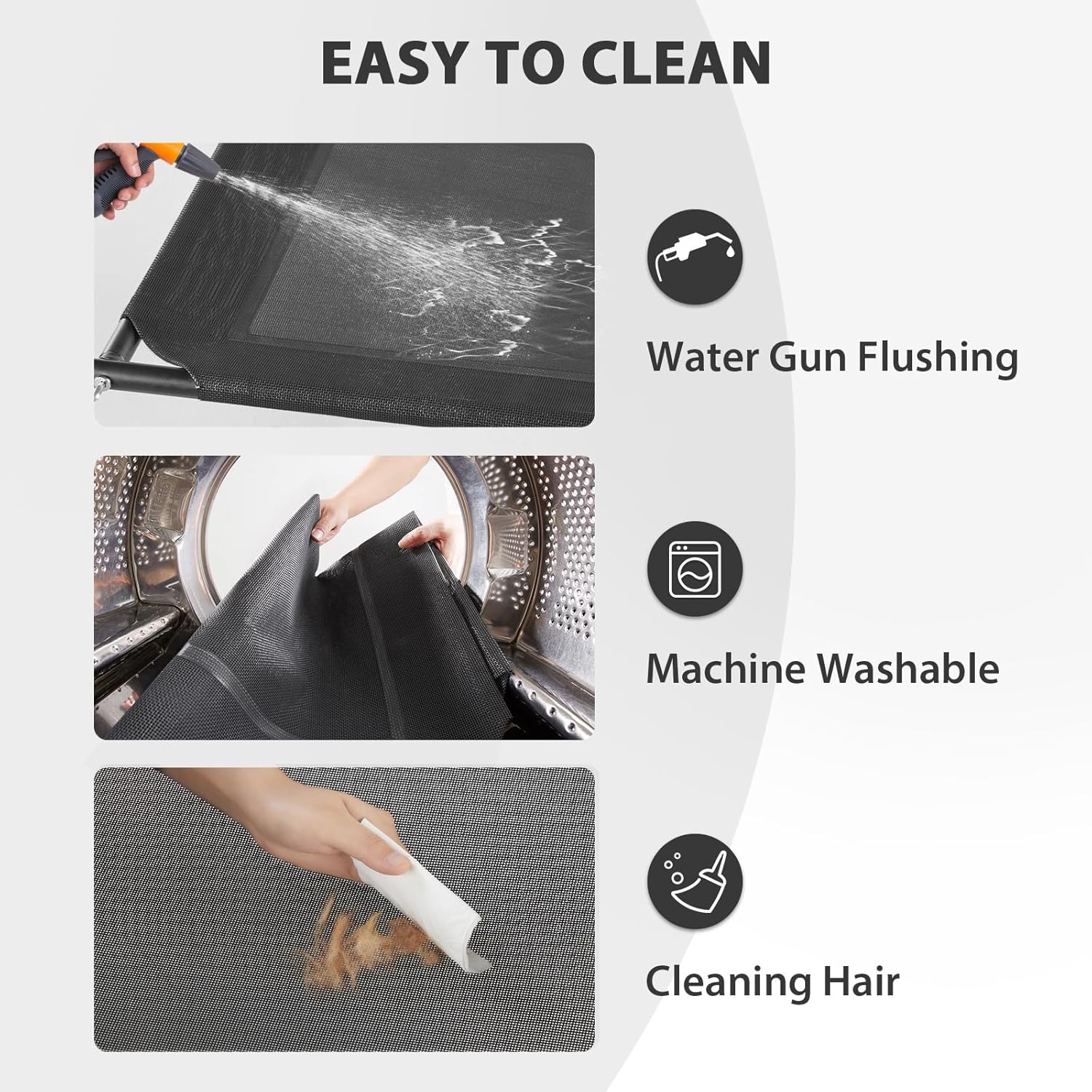 • 【DOG BED EASY CARE】: This cooling elevated dog bed is super easy to clean. Pet hair, vomit, and dust can be quickly wiped away, or you can wash the mesh with tap water, a hose, or a damp towel. For a deeper clean, use mild soap or natural cleaning agents. No more worries about pet odors, dirt, or excessive hair. (Note: Wash the U-shaped pillow separately with pet shampoo.)