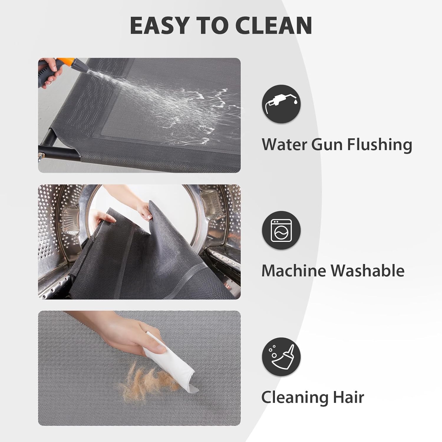 • 【DOG BED EASY CARE】: This cooling elevated dog bed is super easy to clean. Pet hair, vomit, and dust can be quickly wiped away, or you can wash the mesh with tap water, a hose, or a damp towel. For a deeper clean, use mild soap or natural cleaning agents. No more worries about pet odors, dirt, or excessive hair. (Note: Wash the U-shaped pillow separately with pet shampoo.)