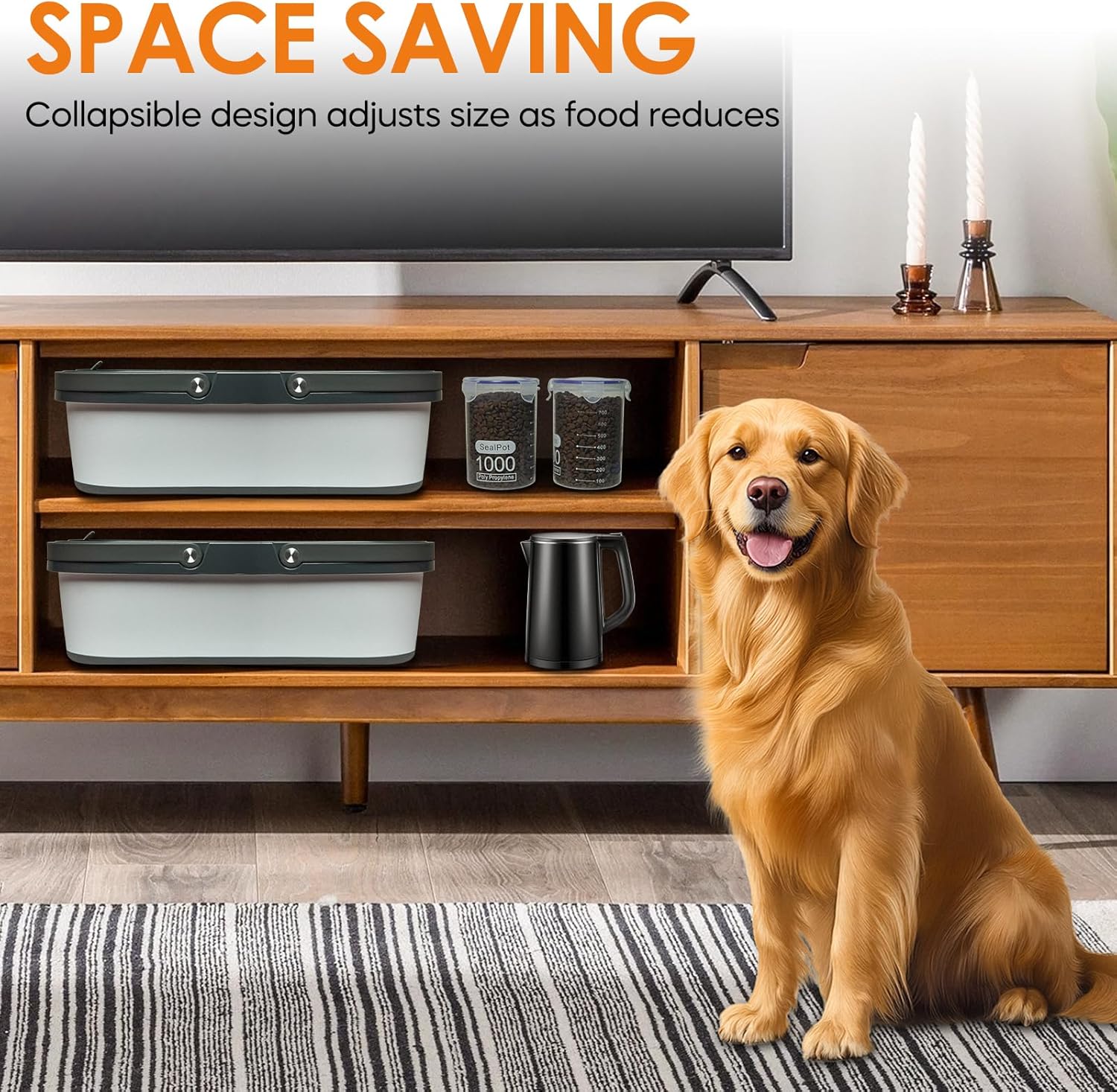 • 【Space-Saving】: Featuring a unique foldable design, this pet food storage bin not only offers convenient storage but also saves space efficiently. It comes in two different sizes. When unfolded, its dimensions are 17.7’’L x 12.9’’W x14’’H, capable of holding up to 35 lbs of dog food. When folded, the dimensions reduce to 17.7’’L x 12.9’’W x5.4’’H, which can store approximately 13lbs of pet food.