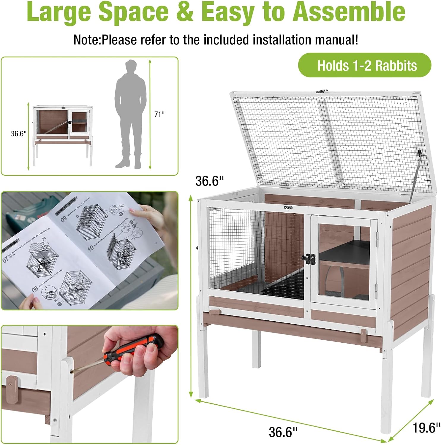 • Spacious Activity Space: Measures 36.6''L x 19.6''W x 36.6''H, providing ample space for 1 rabbit and 1-2 hamsters, guinea pigs, or gerbil.