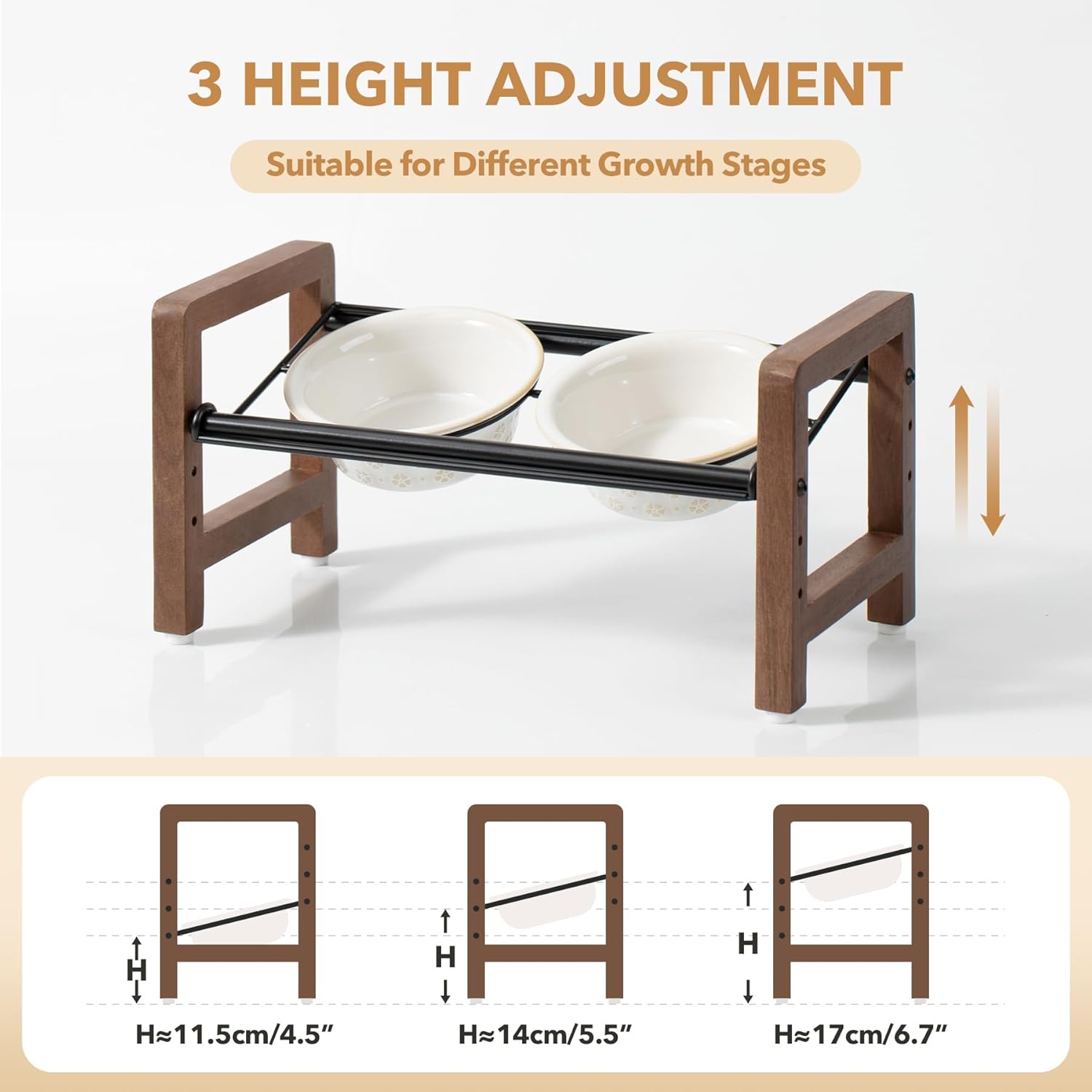 6.3inch Ceramic Adjustable Raised Double Bowls Set with Stand, 3 Heights Elevated, 2 Placement Options,Food and Water Bowls for Adult Cat Small and Medium Dog(Reactived Glaze -White)