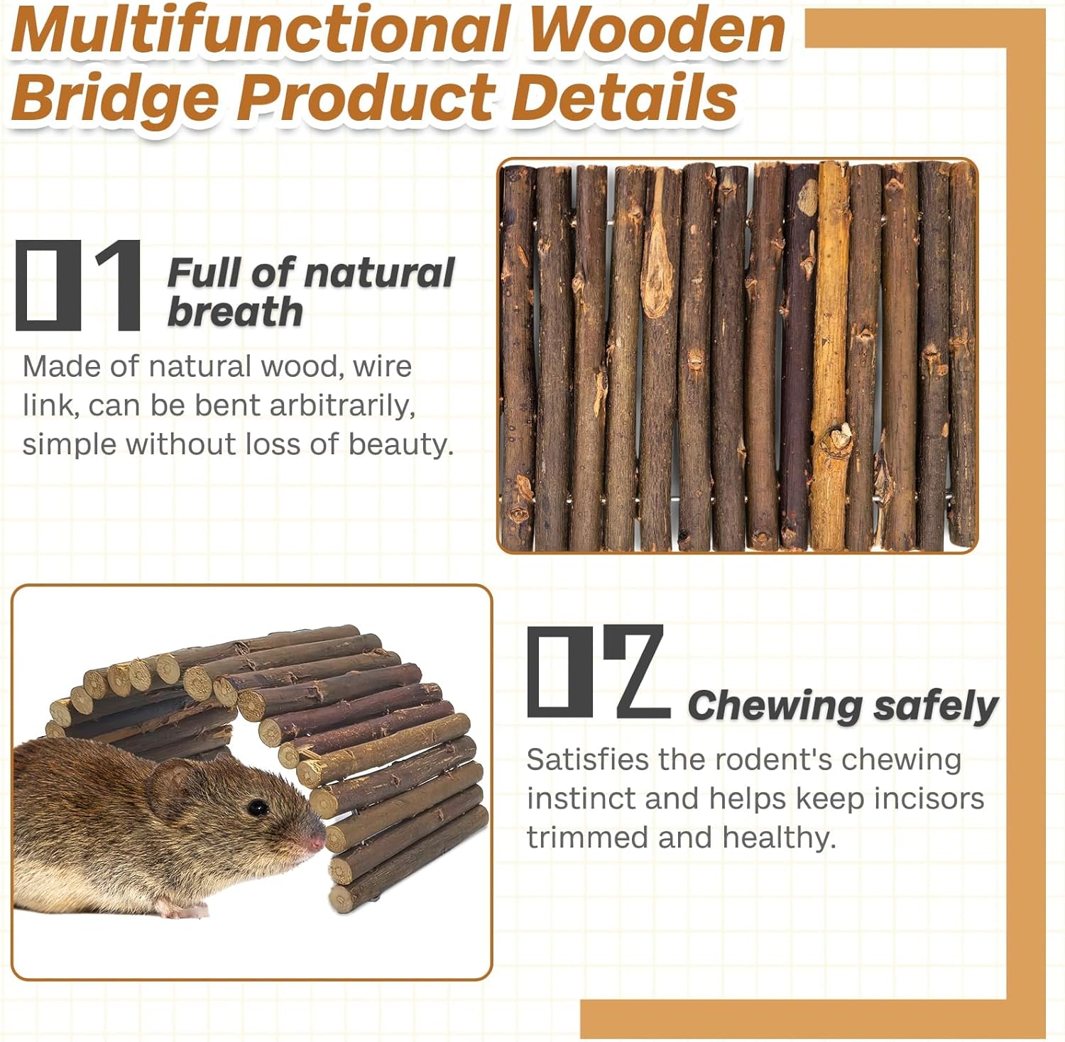 • Multi-Functional Value Set: This set includes 8 reusable wooden bridges (8.7" x 3.95") that double as snug domed shelters or nesting tunnels. The expandable design maximizes space and enriches your pet’s home without clutter.