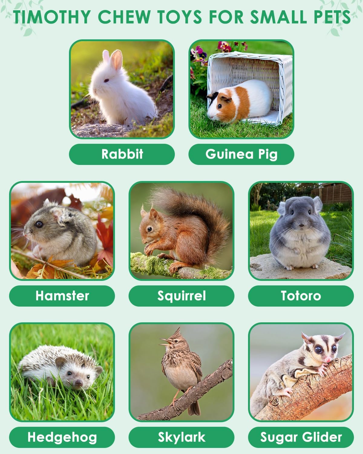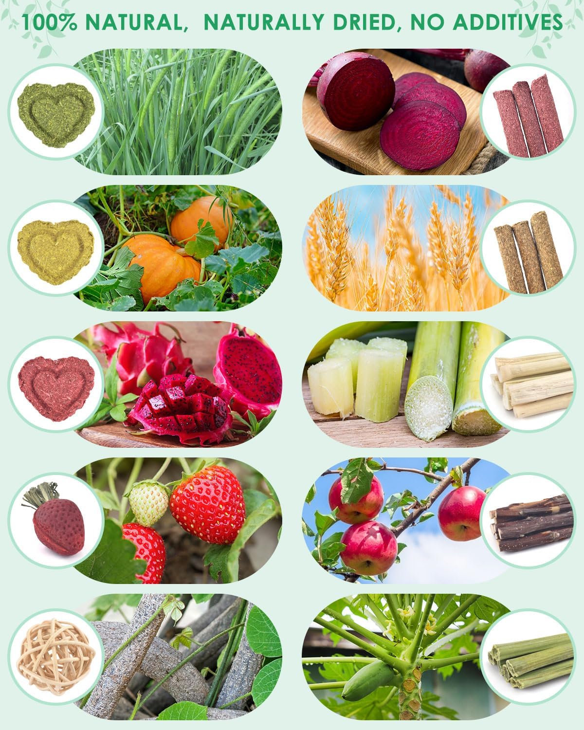 • 53 PIECES OF GUINEA PIG CHEW TOYS: 5 each of Timothy/Wheat/Beet+10 Applewood+6 Sweet Bamboo+6 Papaya Stems+6 Strawberries * 2+Mushrooms * 2+Heart shaped Grass Cake Timothy/Pumpkin/Dragon Fruit * 2 each+3 Original Vine Balls/Star Cake * 3 each