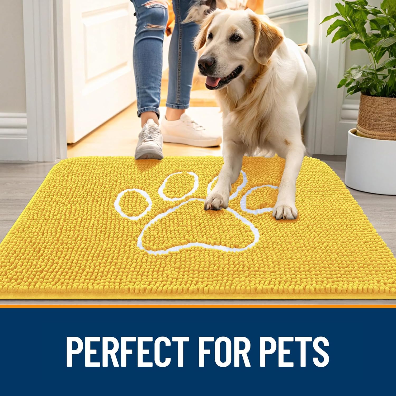 OLANLY Door Mat for Muddy Dog Paws 36x24, Ultra Absorbent Chenille Mud Doormat with Paw Print Design, Non-Slip Washable Doormat for Indoor Entryway, Quick-Dry Pet Bed Mats for Dirty Dogs, Yellow