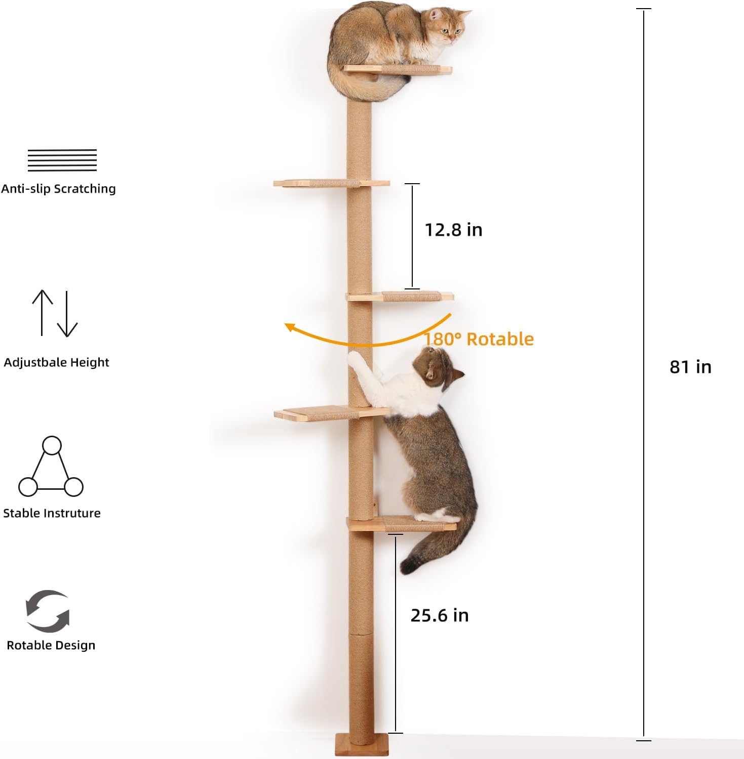 • DIY DESIGN - The scratching post of the cat tree is 360°rotable. You can turn it over and use it on the other side when you find one side is worn. The adjustable height allows the tree to be customized, and the cat platform is not mounted to the wall, giving you the flexibility to DIY a spiral ladder for your cats.