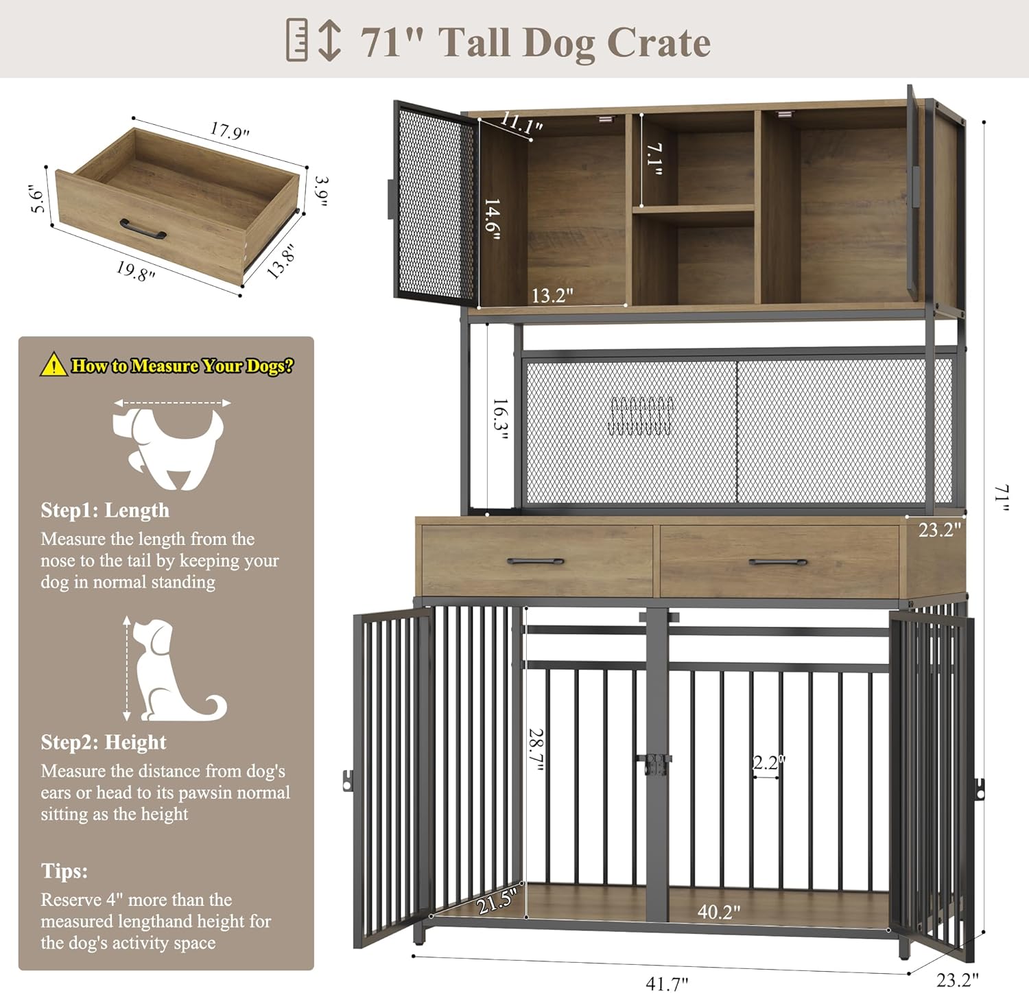 HITHOS 71" Tall Dog Crate Furniture, Indoor Dog Kennel with Hutch, 42" W Dog Cage for Large/Medium Dogs, Wood Dog Crates with 2 Storage Drawers, Heavy Duty Pet House, Rustic Brown