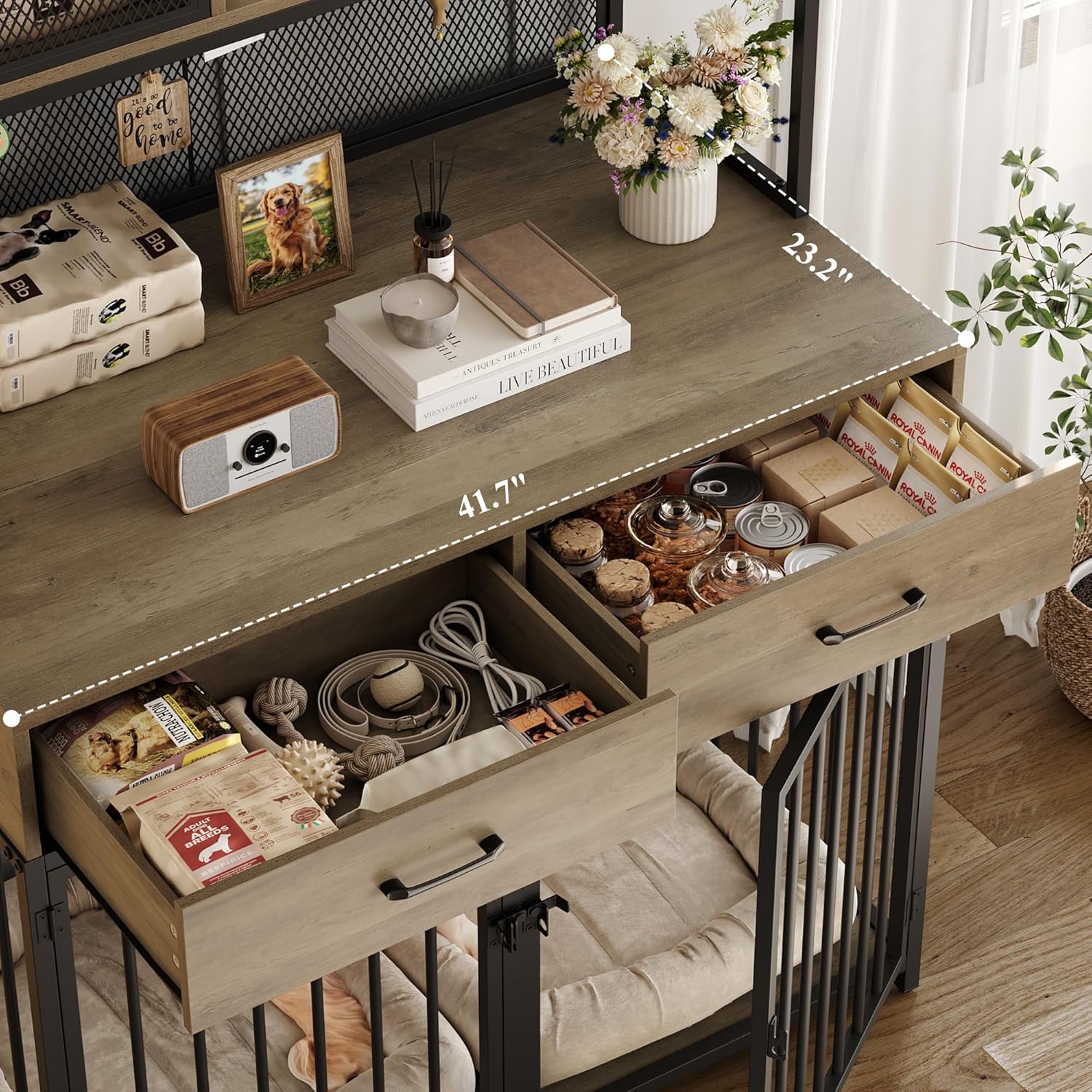 • LARGE STORAGE: The dog crate comprises the top storage hutch, 2 large drawers and a generously spaced living area at the bottom, which can not only provide ample room for dog's toys, food and leashes, but also allow you to showcase an array of delightful canine-themed decor items