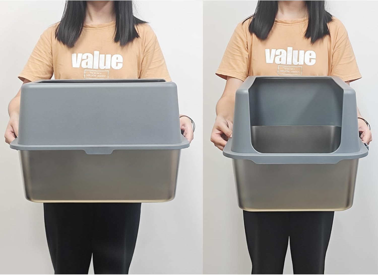 • Litter Box High Sides Design: The rim of the extra large stainless steel litter box is wide and overlaps the edge of the lid completely. No more worrying about the lid being kicked over. Overlapping design of this cat litter tray keeps urine and litter in the large stainless steel litter box and won't seep out through the seams, keeping the air fresh.