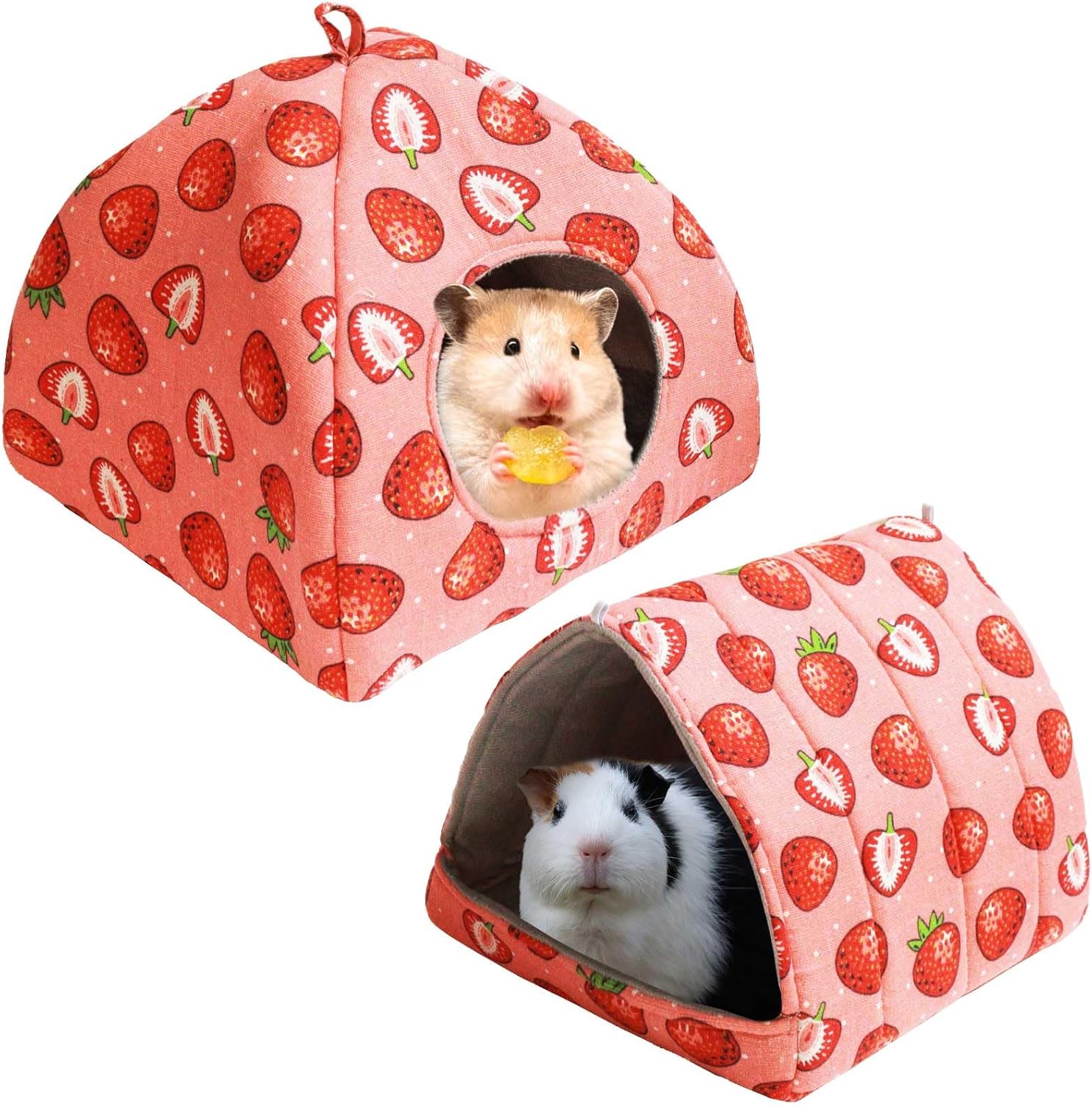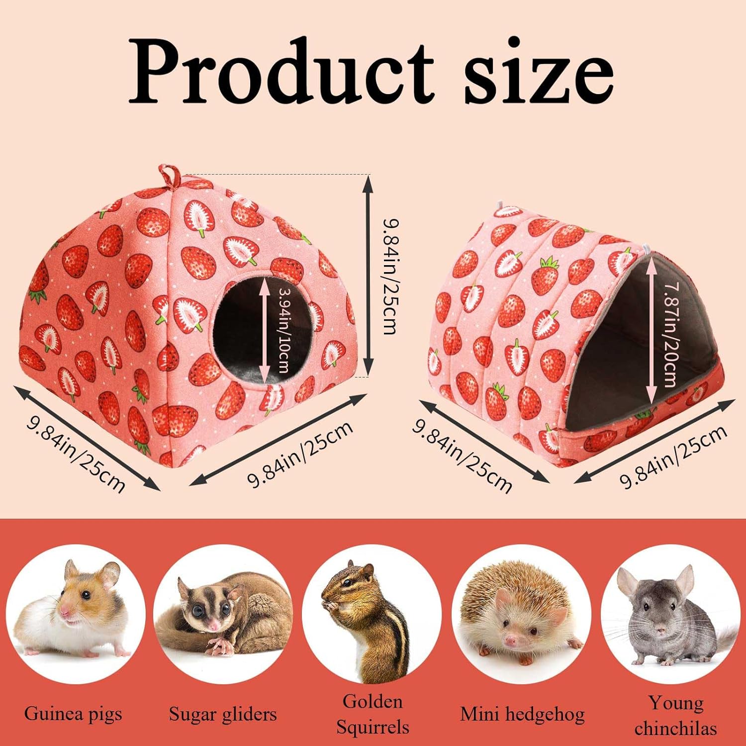 • Charming Shape Set for Versatile Comfort--This 2-piece hideout bundle includes a cozy Mongolian Tent (9.84”x9.84”x9.84”/25cm³) and a spacious Large Triangle (9.84”x9.84”x7.87”/25x25x20cm), offering pets diverse spaces to hide, nap, or explore. The playful strawberry print adds a vibrant, home-friendly aesthetic to both shapes, ensuring they complement any room or cage decor