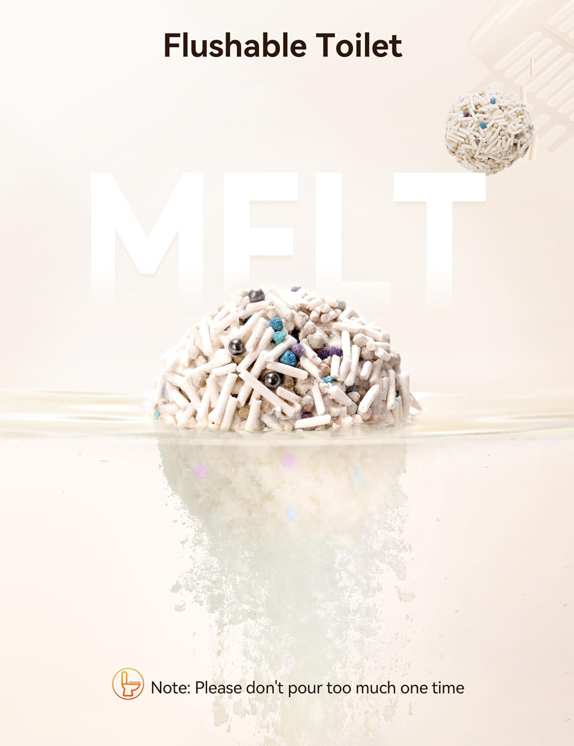 • 【Food-Grade Ingredients & Flushable】Our cat litter made from natural food-grade pea and corn fibers, safe and additive-free to ensure safe toileting for your feline. This cat litter can be dissolve in water and can be poured into the toilet (Note: pour small amounts of litter into the toilet multiple times to prevent clogging)
