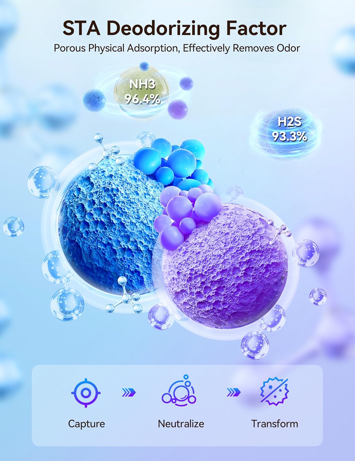 • 【Plant-Based Enzyme Odor Elimination Technology】Compound tea polyphenols and other plant extracts alters the microbial structure of pet waste, reducing activity and synergistically breaking down skatole—the primary source of fecal odor. Enhanced with O2-STA odor-lock technology and zeolite granules, it traps and neutralizes ammonia and stubborn smells, ensuring long-lasting freshness.