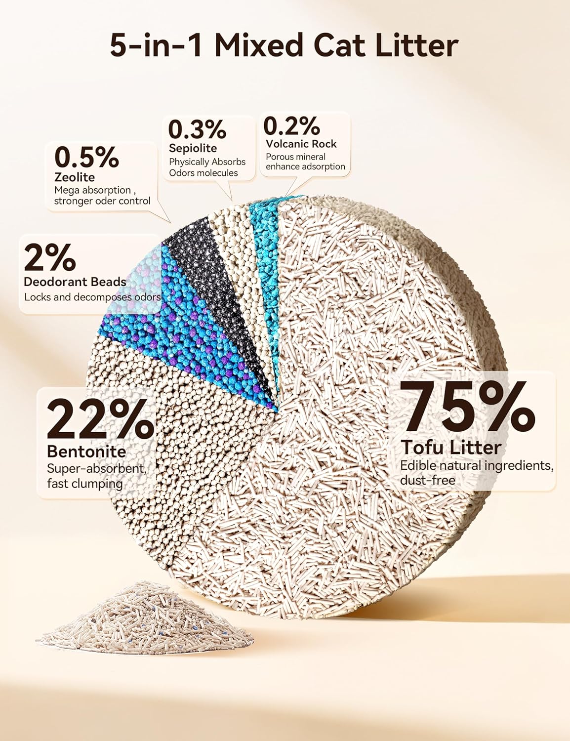 • 【5-in-1 Mixed Cat Litter】Meowant mixed cat litter adopts a scientific ratio, combining 75% tofu cat litter, 22% bentonite cat litter, 2% blue-purple deodorant beads, and adds zeolite, crushed mineral sand to improve stability. Mixed clumping cat litter is ideal for multi-cat households.