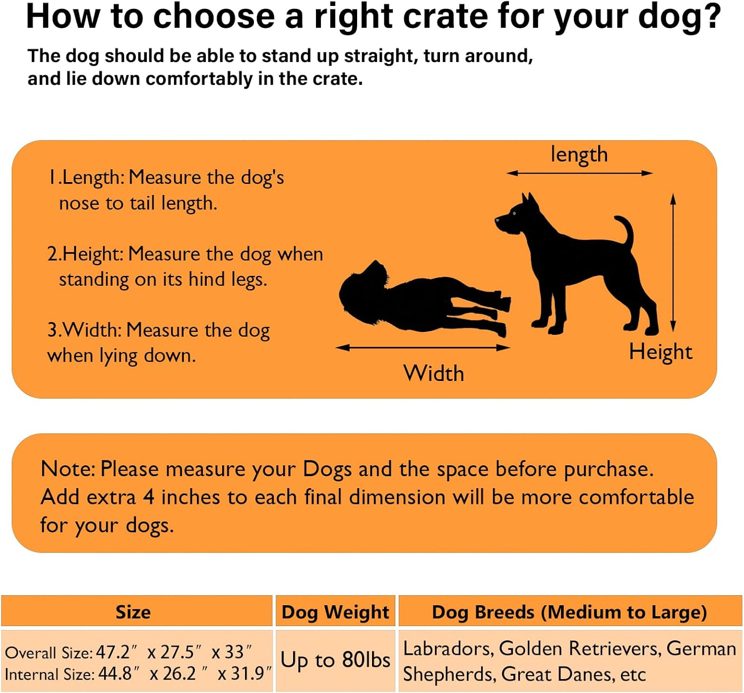 • 【Spacious Interior】 Overall dimensions is 47.2"W x 27.5"D x 33"H. This large dog crate offers ample room for large breeds to stand, turn around, and lie down comfortably. Note: Measure your dog and the space where the dog cage is to locate before purchasing.