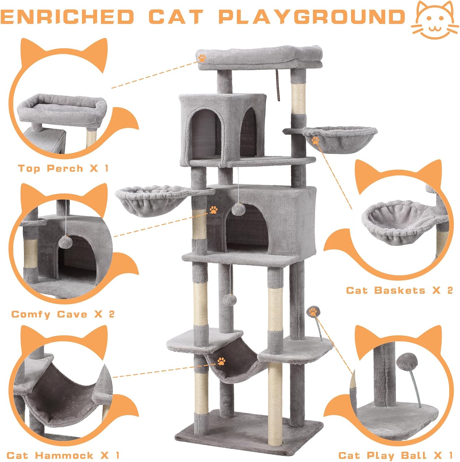 70-Inch Cat Tree,Large Cat Tree Tower with Hammock, Scratching Post, Condo and Multi-Level Cat Tower for Large Cats, Cat Activity Center Playhouse, Light Gray LCT016