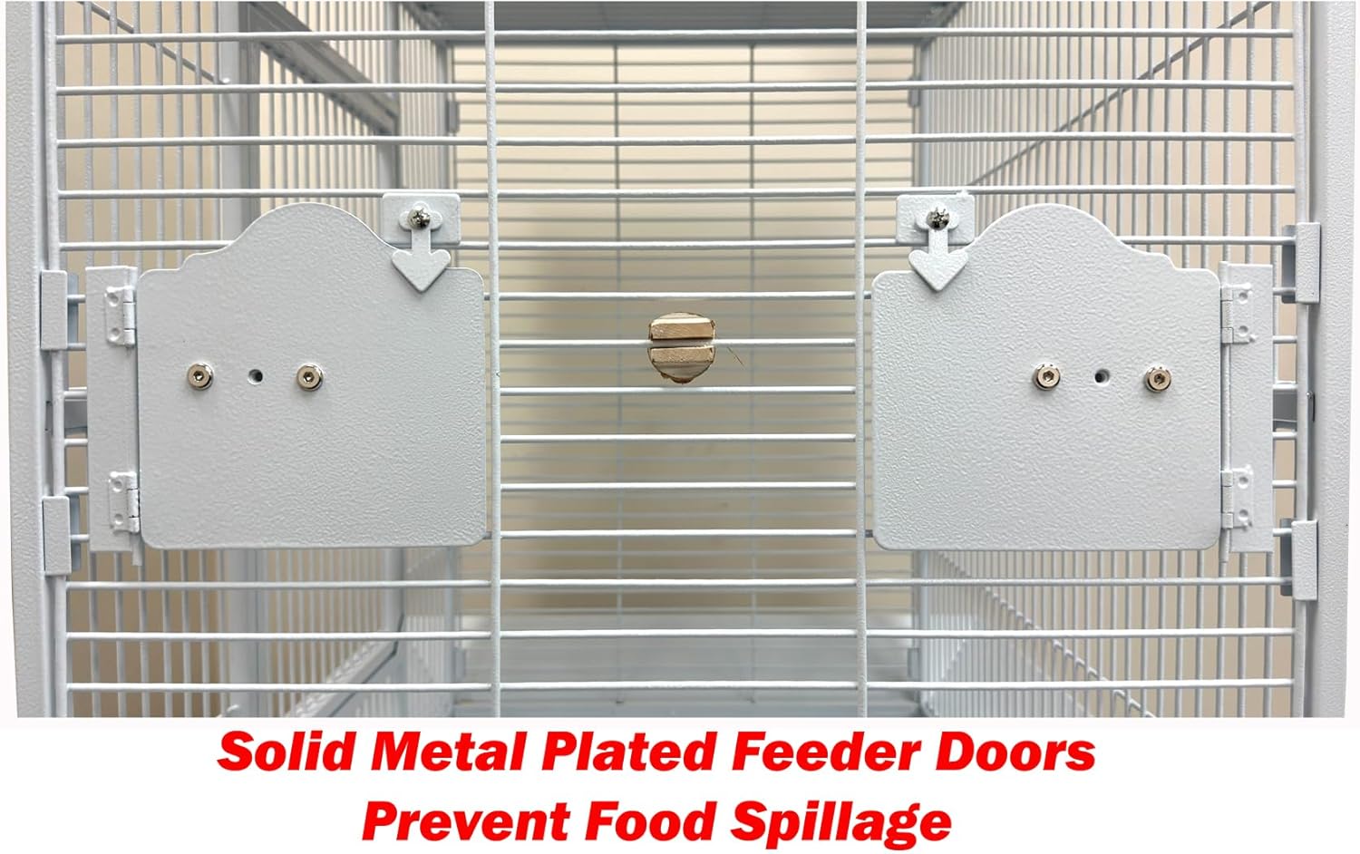 • 【Swivel Solid Metal Feeder Doors】 Prevent Spillage With Two Large 5" Stainless Steel Feeder Cups , Inside Natural Wooden Stand Perch Included.