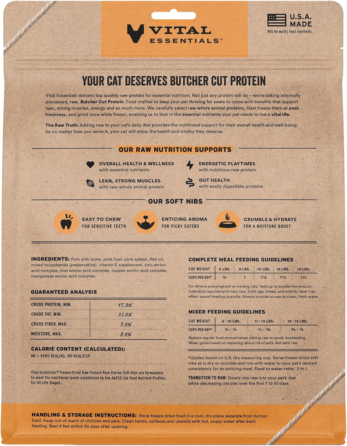 • SOFT NIBS FREEZE-DRIED RAW PORK CAT FOOD: Vital Essentials Freeze Dried Cat Food packs more protein than industry standard into every soft bite to deliver the peak vitality your cat deserves, especially when compared to dehydrated cat food. Our complete and balanced freeze-dried raw cat food is made with Butcher Cut premium pork, responsibly sourced in the USA.