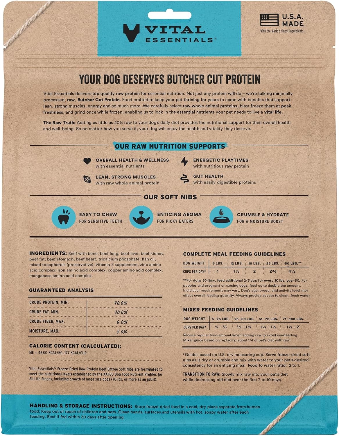• SOFT NIBS FREEZE-DRIED RAW BEEF DOG FOOD: Vital Essentials Freeze Dried Soft Nibs Dog Food packs more protein than industry standard into every soft bite to deliver the peak vitality your dog deserves, especially when compared to dehydrated dog food. This complete and balanced freeze-dried raw dog food is made with premium Butcher Cut beef, responsibly sourced in the USA.