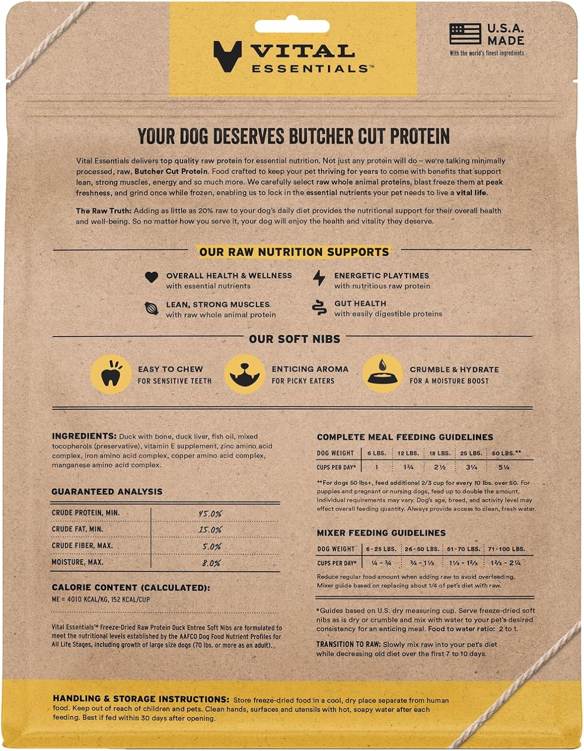 • SOFT NIBS FREEZE-DRIED RAW DUCK DOG FOOD: Vital Essentials Freeze Dried Soft Nibs Dog Food packs more protein than industry standard into every soft bite to deliver the peak vitality your dog deserves, especially when compared to dehydrated dog food. This complete and balanced freeze-dried raw dog food is made with premium Butcher Cut duck, responsibly sourced in the EU.