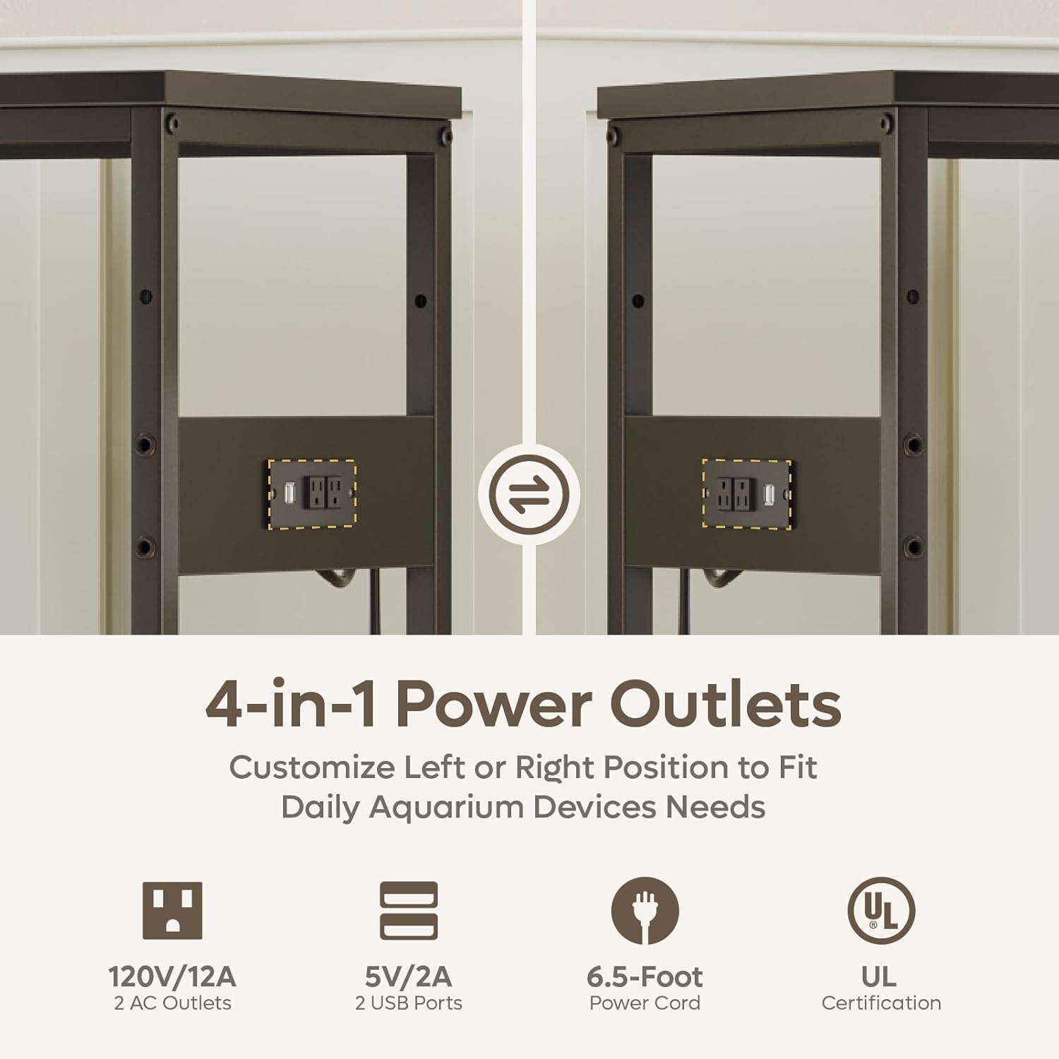 • 4-in-1 Power Outlets: The 29 gallon fish tank stand includes 2 AC and 2 USB outlets, installable on either side for flexible cable management, ideal for powering filters, lights, heaters, and charging devices
