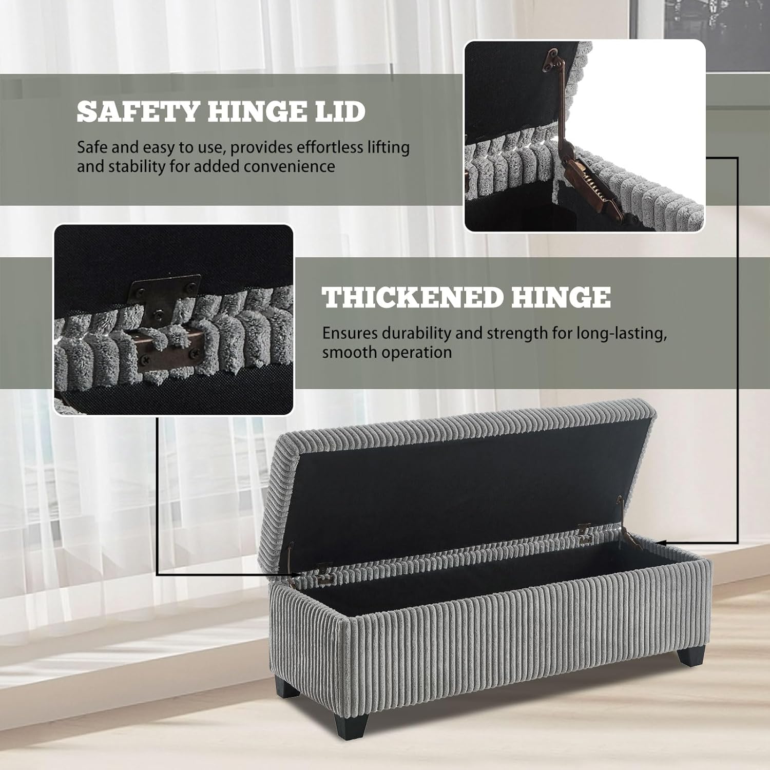 • Spacious Hidden Storage: Designed with a large interior compartment, this grey corduroy ottoman bench with storage provides ample storage space to keep blankets, books, or shoes neatly tucked away.