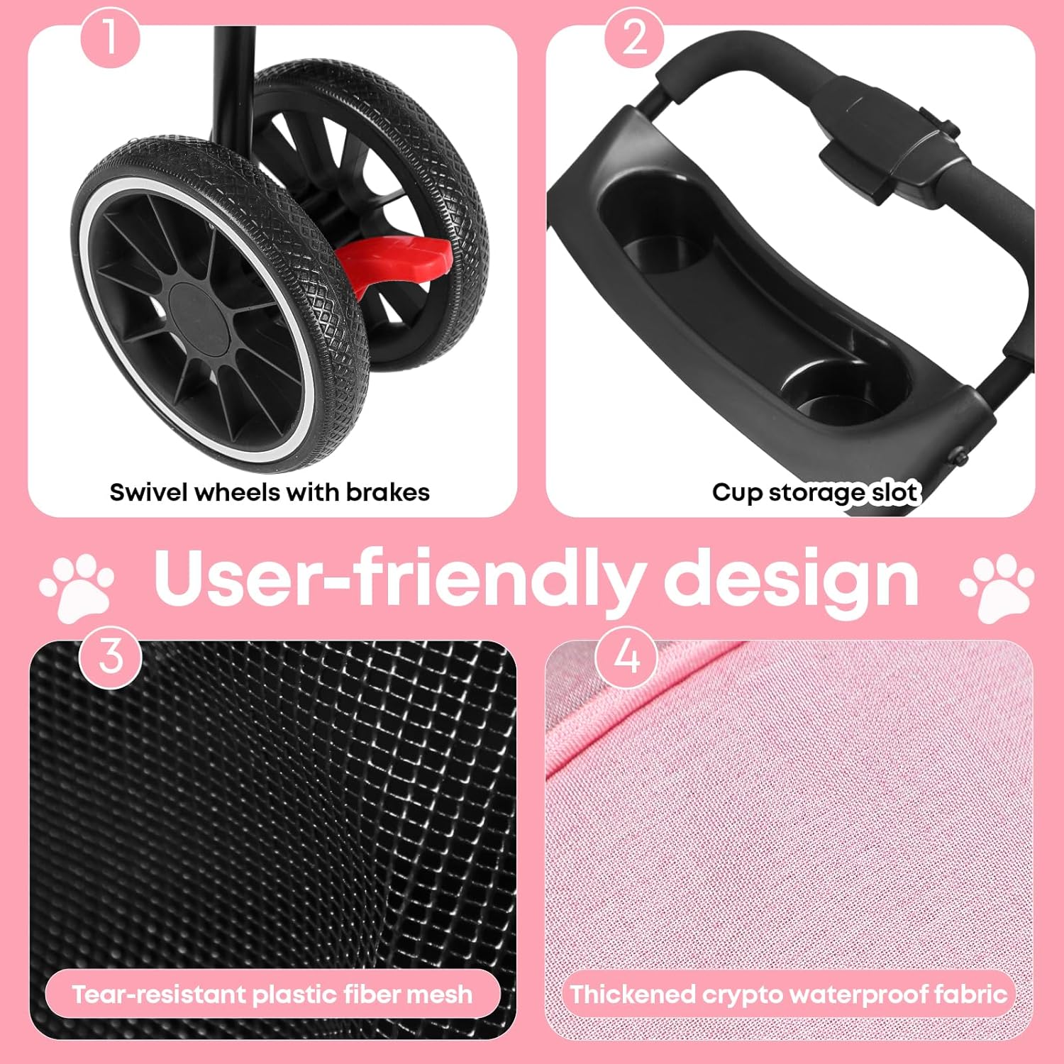 • [All-Terrain Safety & Control] The cat stroller equipped with 360° swivel front wheels for smooth maneuverability and dual rear brakes for instant stopping power. It glide seamlessly on sidewalks, grass, or uneven terrain, ensuring a safe ride