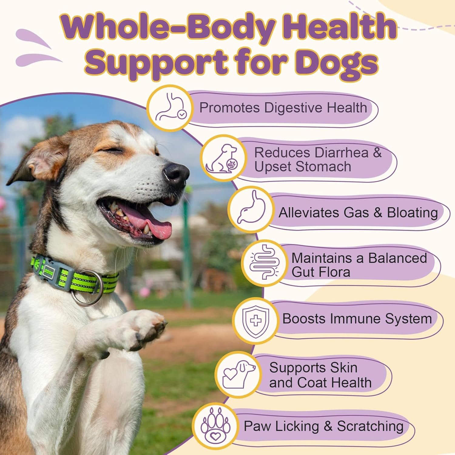• Promotes Immune & Vitality: Our pet probiotics for dogs enhance gut health—home to 70% of the immune system, boost your dog's natural defenses. Dog probiotic added vitamins promote vitality, and support overall wellness