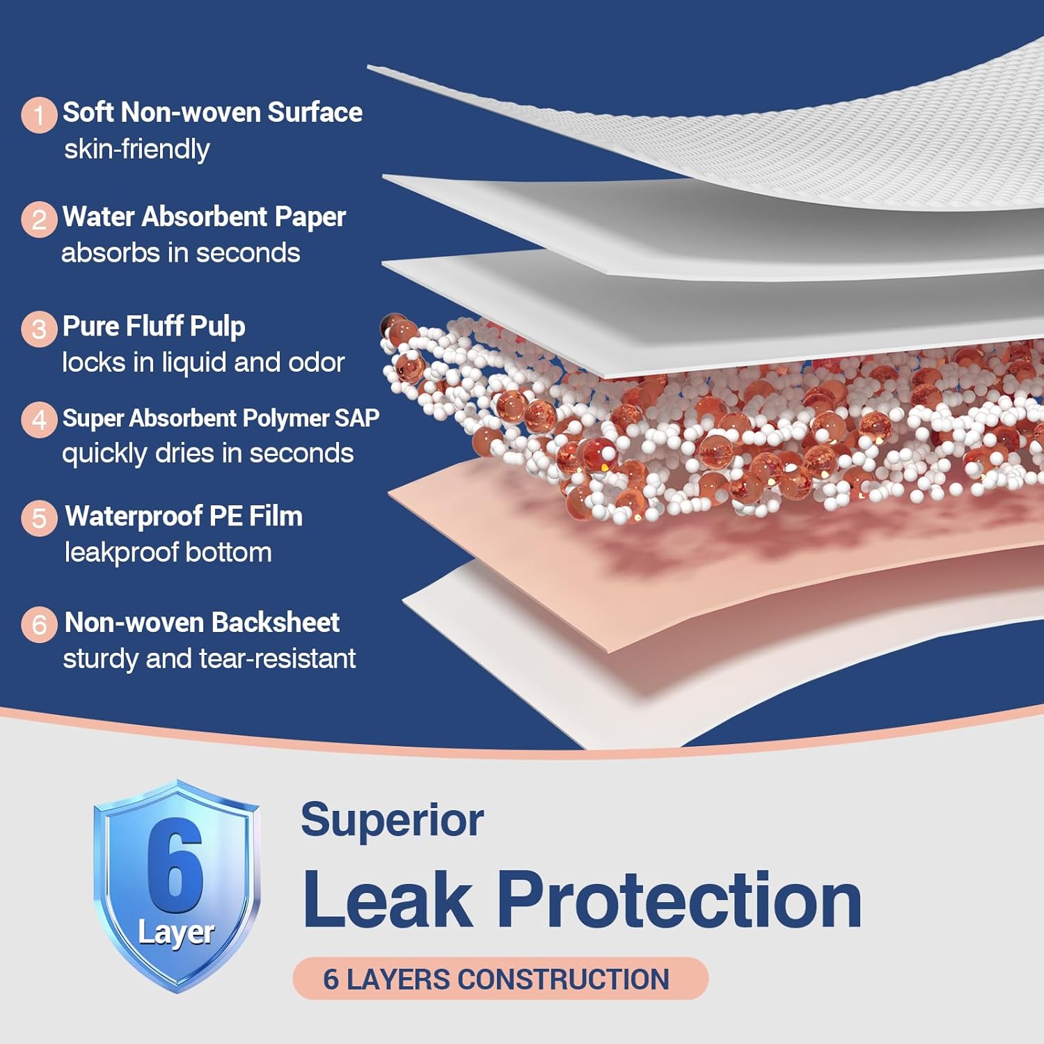 • 3XL For Bed Protection: Our bed pads disposable adult in size 40" x 36"(approx 101 x 91 cm) are bigger and thicker than most incontinence underpads. It provides a larger absorption area and stronger absorption capacity, effectively preventing liquid leakage from the surrounding