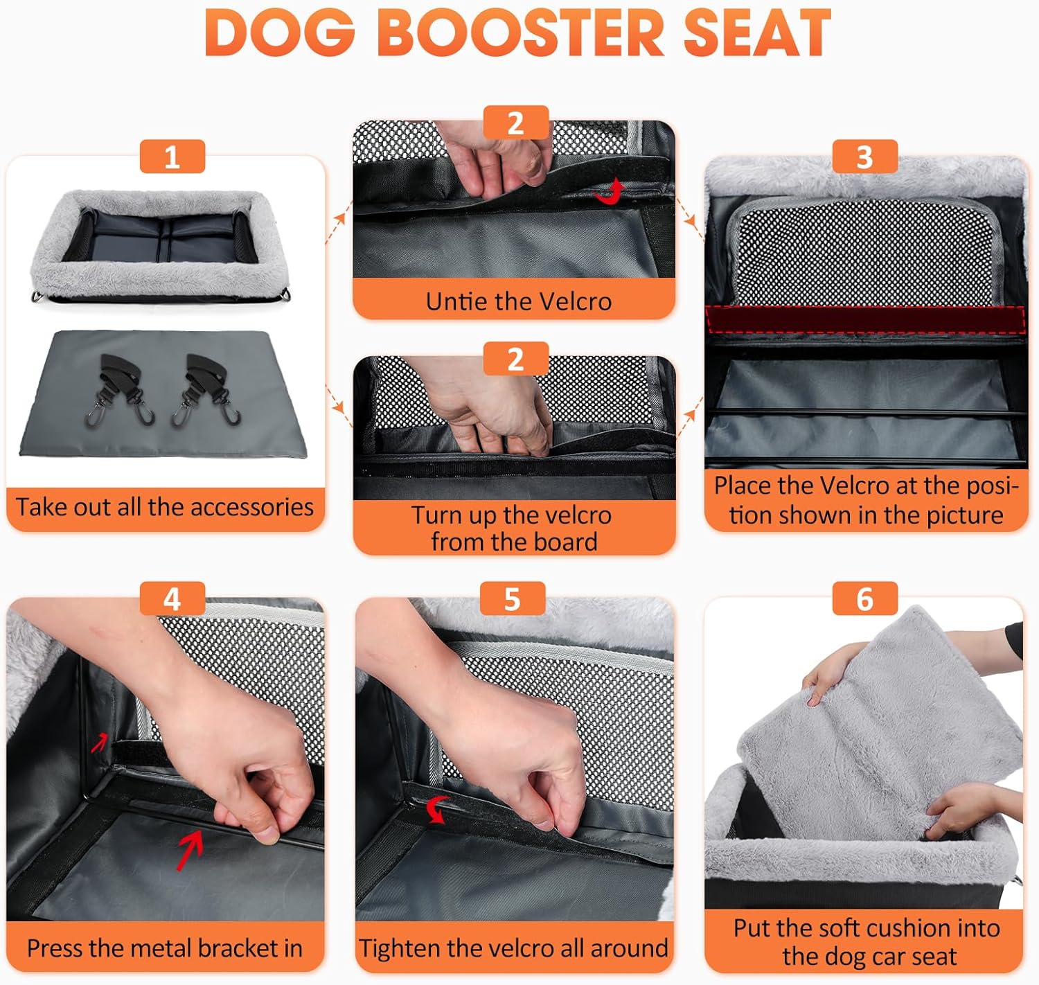 • 🐶[Cozy and Durable Material]: The dog booster car seat is crafted from durable Oxford cloth that’s water-resistant, and durable. The plush rim is filled with soft material for your furry friend to rest their paws. With an air-circulating mesh design, the seat promotes smooth breathing, ensuring a comfortable ride. Additionally, The thick cushion provides a cozy ride, making it perfect for your pet's travel needs.