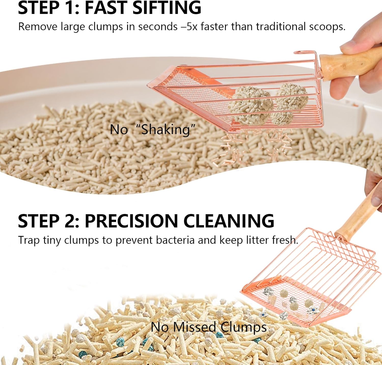 • ★ Comfortable & Ergonomic Design – The upgraded handle is now extra sturdy and won’t loosen over time. Made from solid wood and shaped for a natural grip, this stainless steel cat litter scoop follows ergonomic principles to reduce hand strain, making scooping easier and more comfortable.
