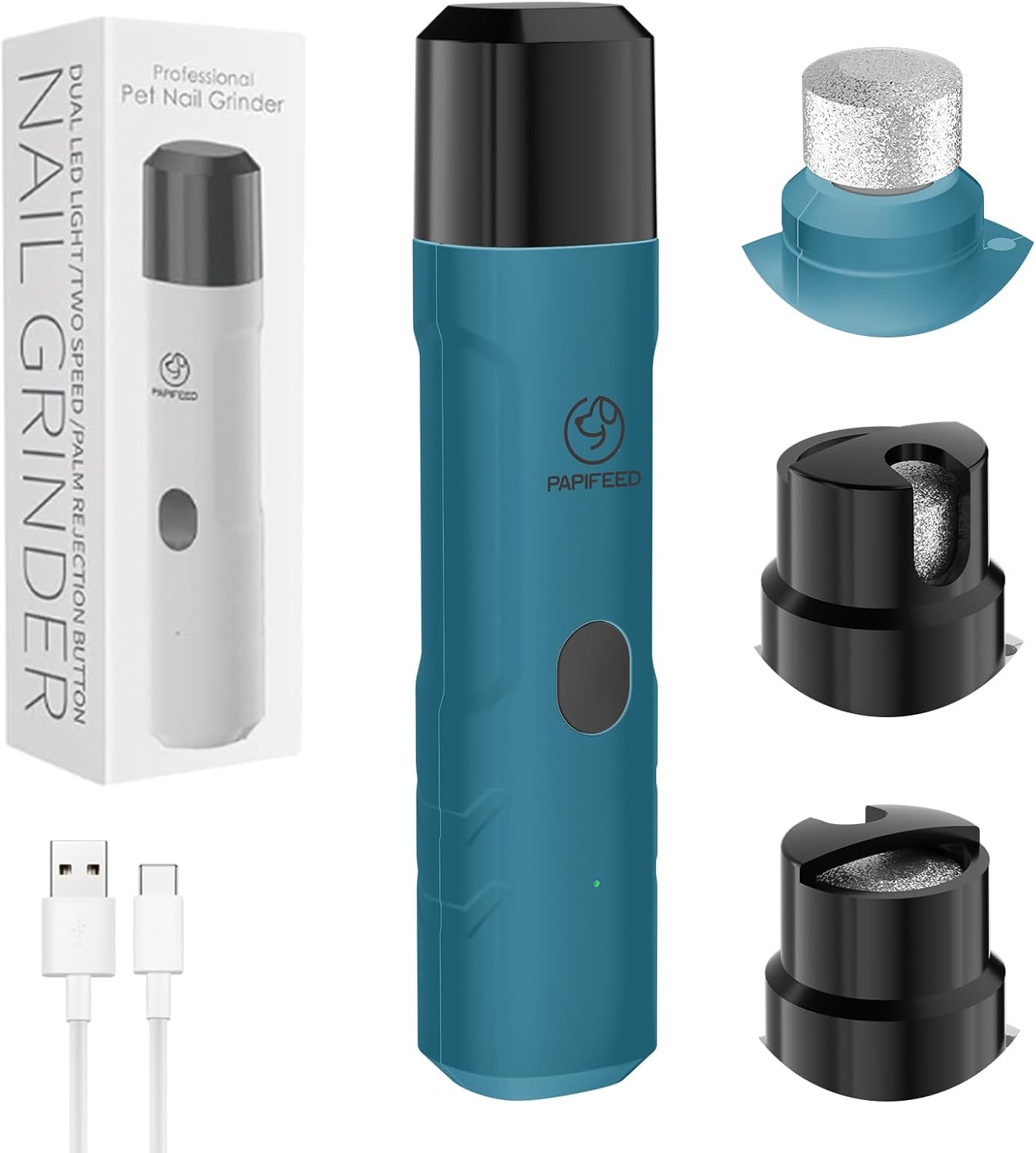 PAPIPAFFEED Dog Nail Grinder Upgraded with 2 LED Lights, 3-Speed Rechargeable & Quiet - Upgraded Electric Pet Nail Trimmer for Small Medium Large Dogs & Cats, Painless Paws Grooming Tool - Blue