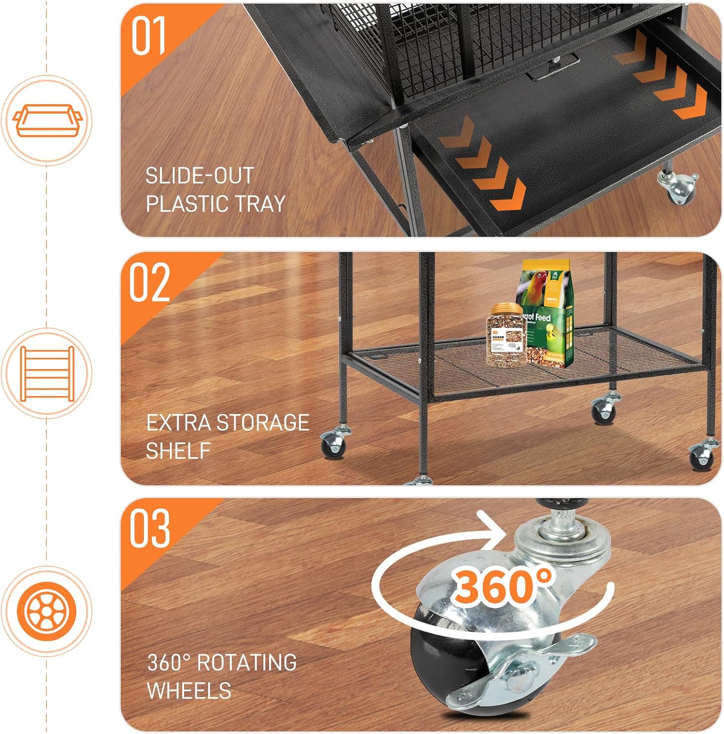 • Effortless Maintenance & Cleanliness: Equipped with slide-out trays and safety metal grille to catch droppings, plus a seed guard to minimize mess. The double tray system makes cleaning quick and effortless.
