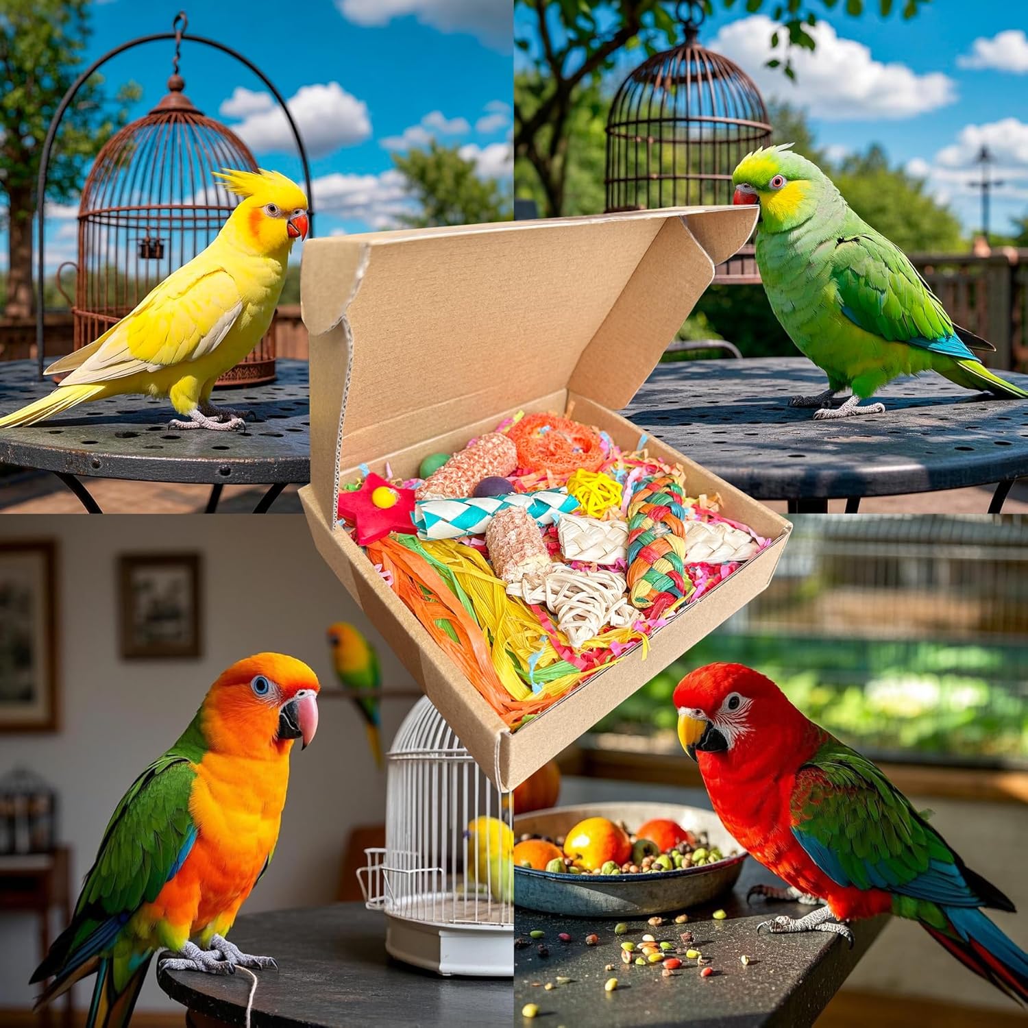 • NATURAL BIRD TOYS EXCLUSIVE DESIGN: Incorporates four natural behavioral layers: Tear Zone: Colorful shredded paper simulates a jungle leaf search. Foraging maze: hidden to stimulate the exploratory instincts Grooming texture: natural fibers promote healthy beak development 3D Climbing Net: 30° angled path that conforms to the bird's structure