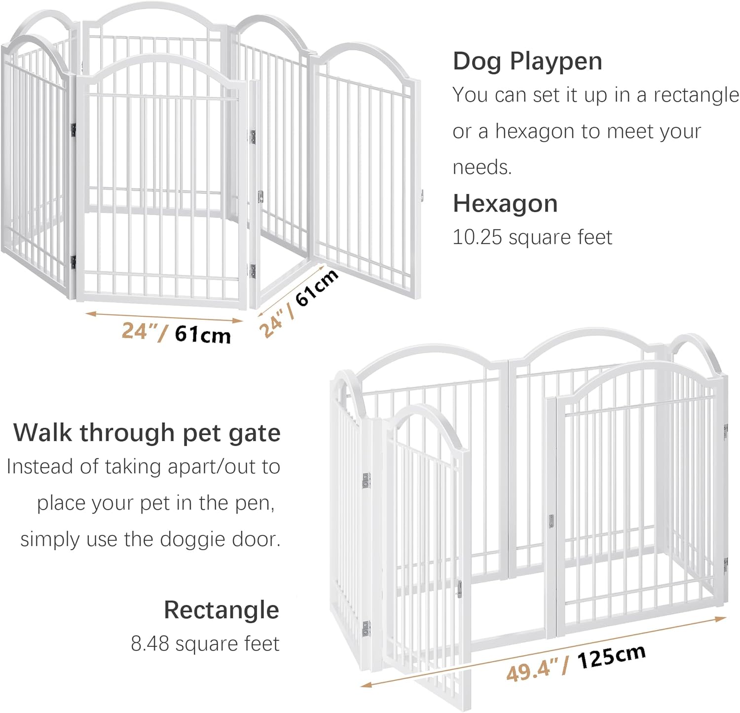 BHG Metal No-Assembly Freestanding Dog Gate with Door Walk Through, Extra Wide 144", Extra Tall 32" Pet Gate, Accordion Puppy Folding Playpen Dog Fence, with 2PCS Support (White, 6 panesl)