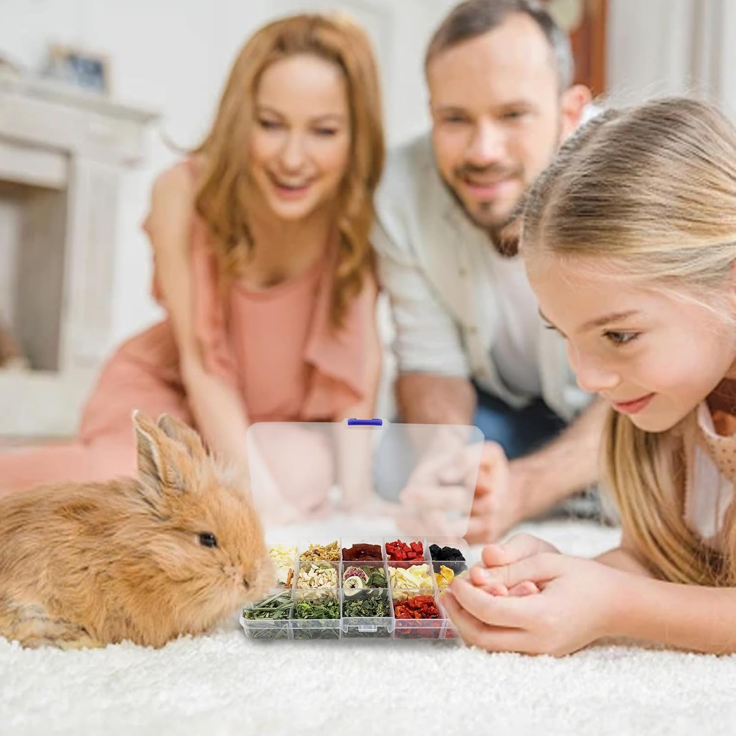• 【Bunny Treats】: Delight your small pet with this treat box featuring 15 kinds of snacks, perfect for rabbits, hamsters, chinchillas, guinea pigs, and more. Every bite is made with care to bring joy to their day.