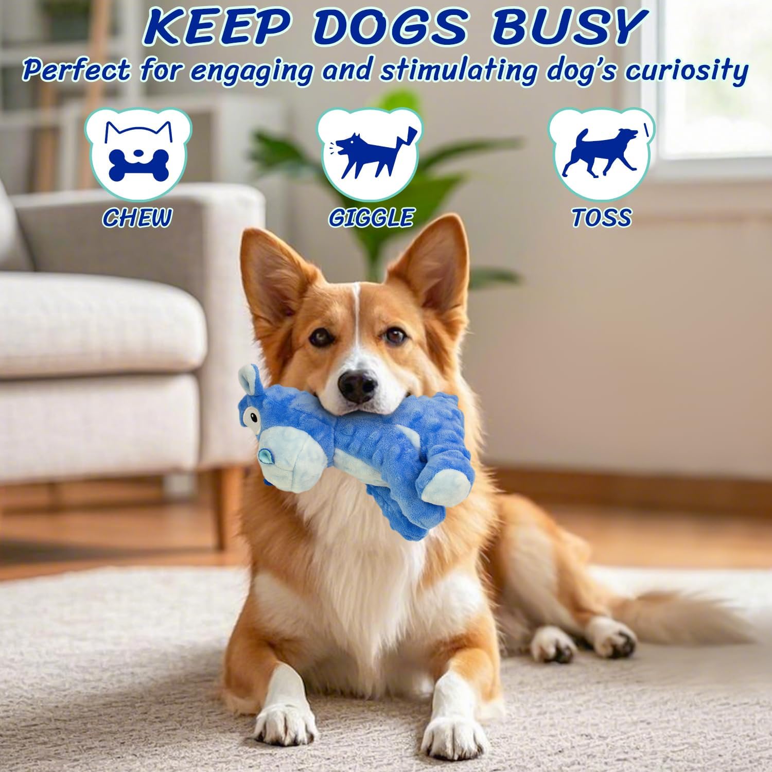• SQUEAKY DOG TOY: This squeaky dog toy has built-in squeaker and crinkle paper. When the dog chews it or you presses it, the toy will make squeaky sound and fully arouse their interest to play, which can avoid destructive chewing and barking.