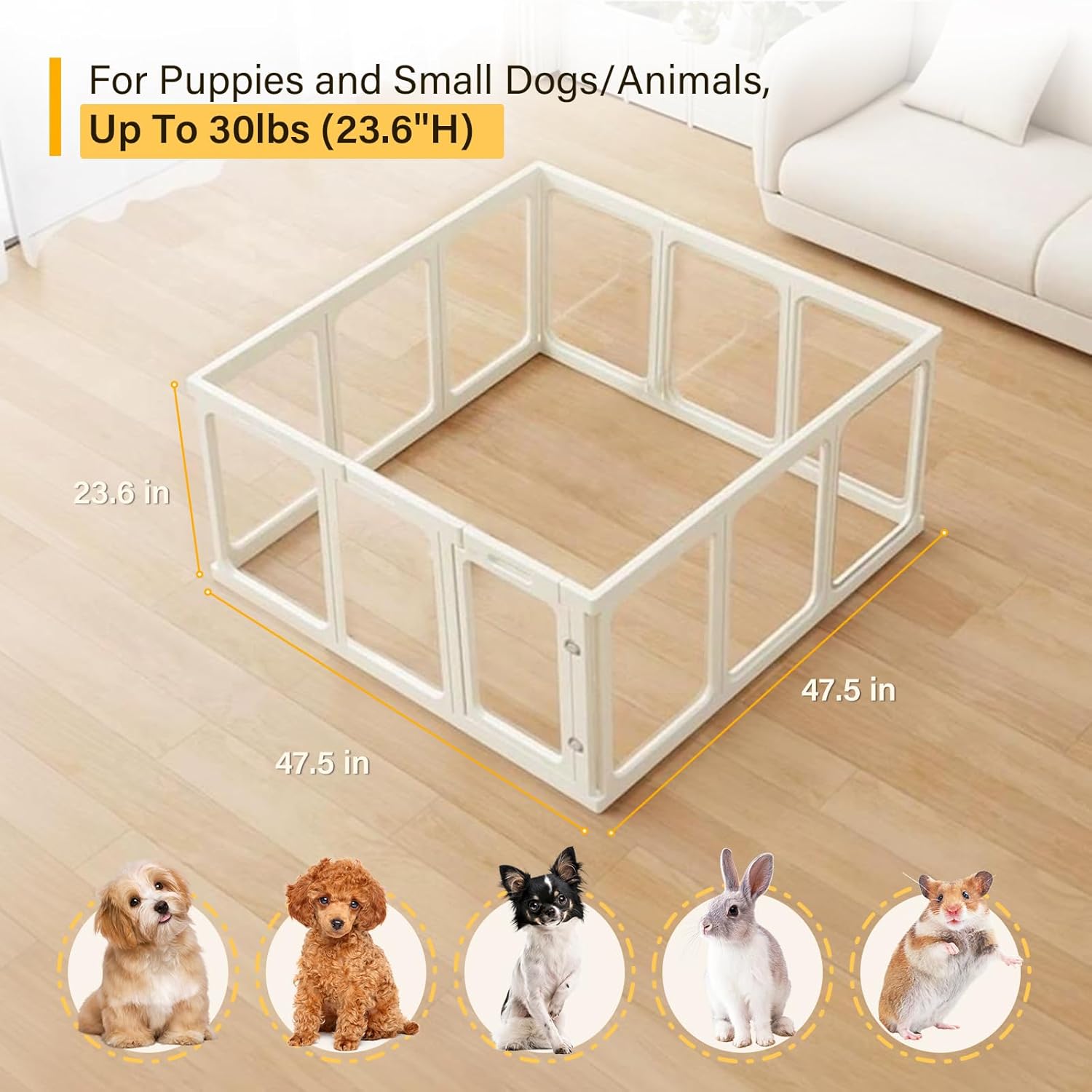 • 【Spacious Design】 With dimensions of 47.5in L x 47.5in W x 23.6in H and 12 panels, this clear dog play pen provides ample space for your pets to move around comfortably. The spacious design ensures they have plenty of room to play and explore.
