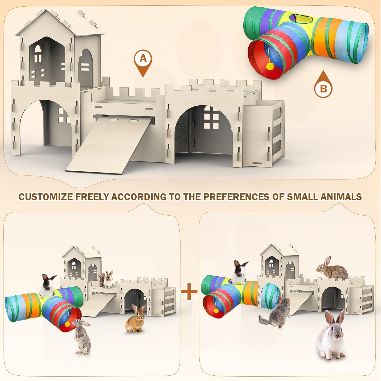 • Versatile Rabbit Hideout for Indoor and Outdoor Use:Whether indoors or outdoors, our rabbit houses and hideouts are versatile enough to suit any environment. The detachable bunny tunnel and easy-to-clean design make it a practical choice for all bunny owners.