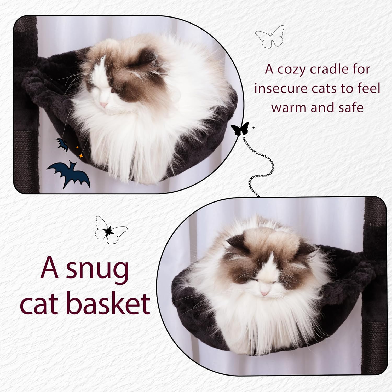• 2 Basket-Shaped hammocks: The hommock on cat house is cat's favorite, giving kitties a feeling of been wrapped up, like sleeping in a soft cloud. There are two!