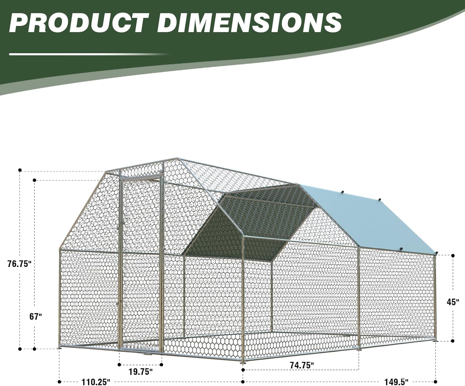 • 【Large Space for 20 Chickens】: The metal chicken coops measures 9.2’Lx12.47’Wx6.4’H and can accommodate around 20 chickens at a time. 6.4' height provides plenty of space for chickens to move around during the day