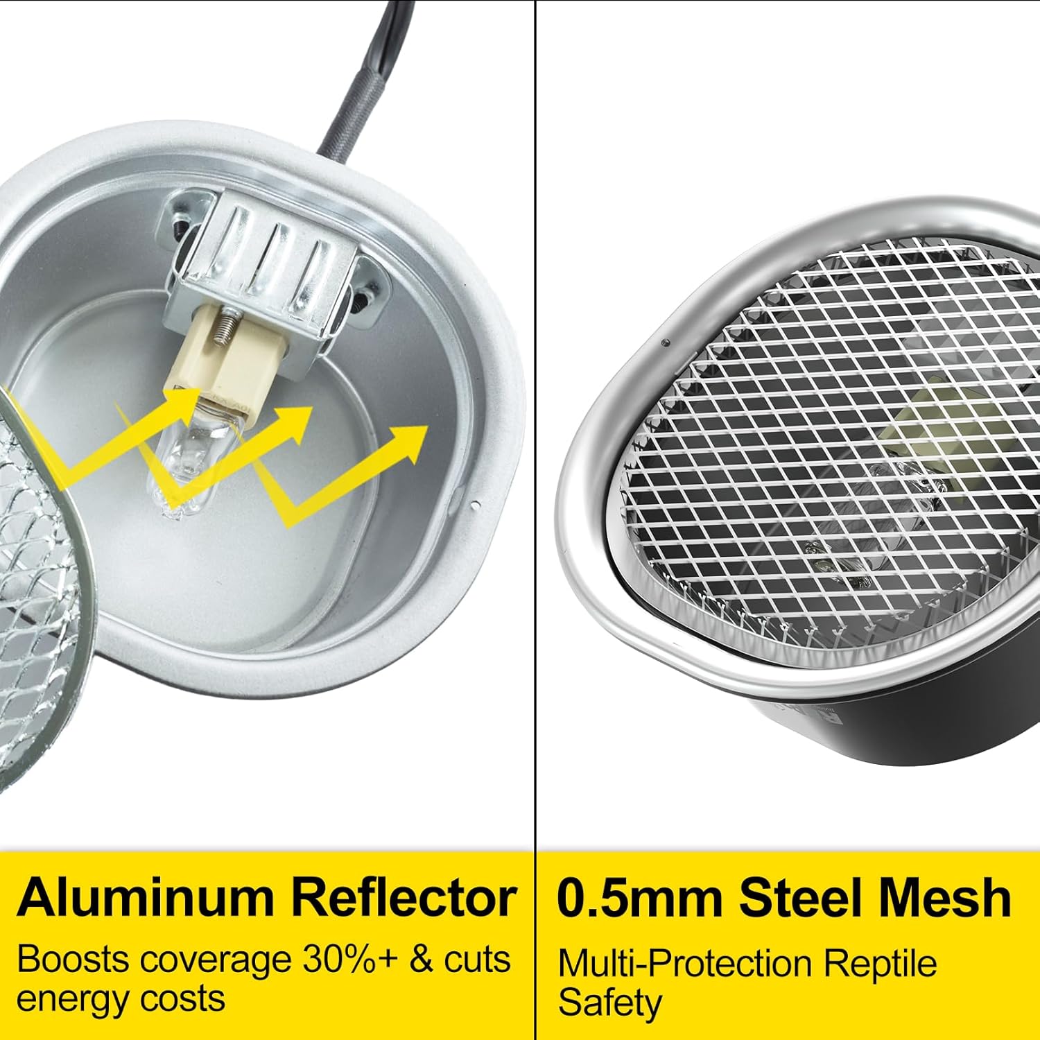 • Enhanced Safety Design: The basking lampshade integrates a protective mesh barrier, preventing reptiles from direct heat source contact. Eliminates the risk of potential accidents or injuries