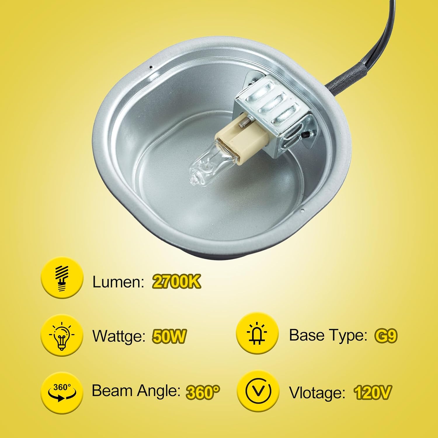• Universal Compatibility & Warranty: This reptile heat lamp fixture works with most standard G9 bulbs MAX 50W(included 1pcs). Backed by our 90-day hassle-free replacement for defects, ensuring reliable habitat heating solutions