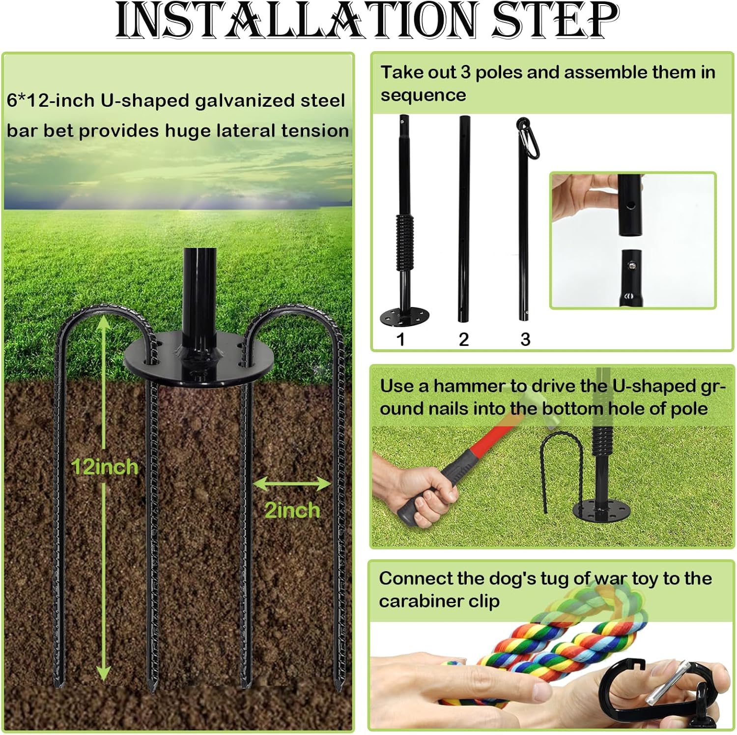 • Dog Solo Play:The tether dog tug toy attracts the dog's chase in the shaking and swing. Pulling and tugging make them endlessly busy,which can release the owner's hands and relieve dog boredom. Compared to traditional outdoor bungee toys that are difficult to install, our toys no need for trees and more convenient to install ,one person can also install them independently on grass