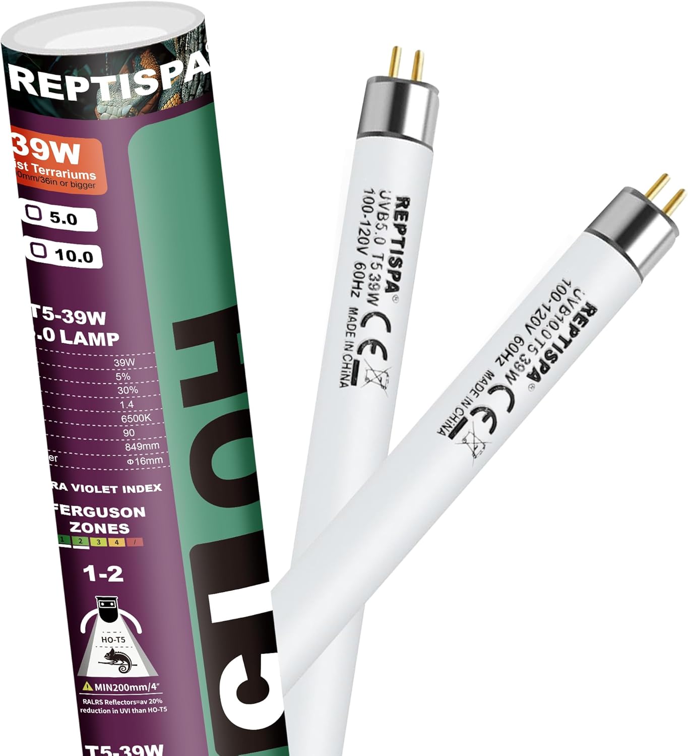 • VERSATILE APPLICATIONS: REPTISPA T5 UVB reptile light is ideal for various reptiles and amphibians, no matter they originate from rainforest or desert. 5.0 UVB bulb is suitable for tropical rainforest species, such as chameleons, snakes, aquatic turtles and frogs. 10.0 UVB bulb is perfect for desert dwelling reptiles, such as bearded dragons, tortoises, uromastyx, and collard lizards.
