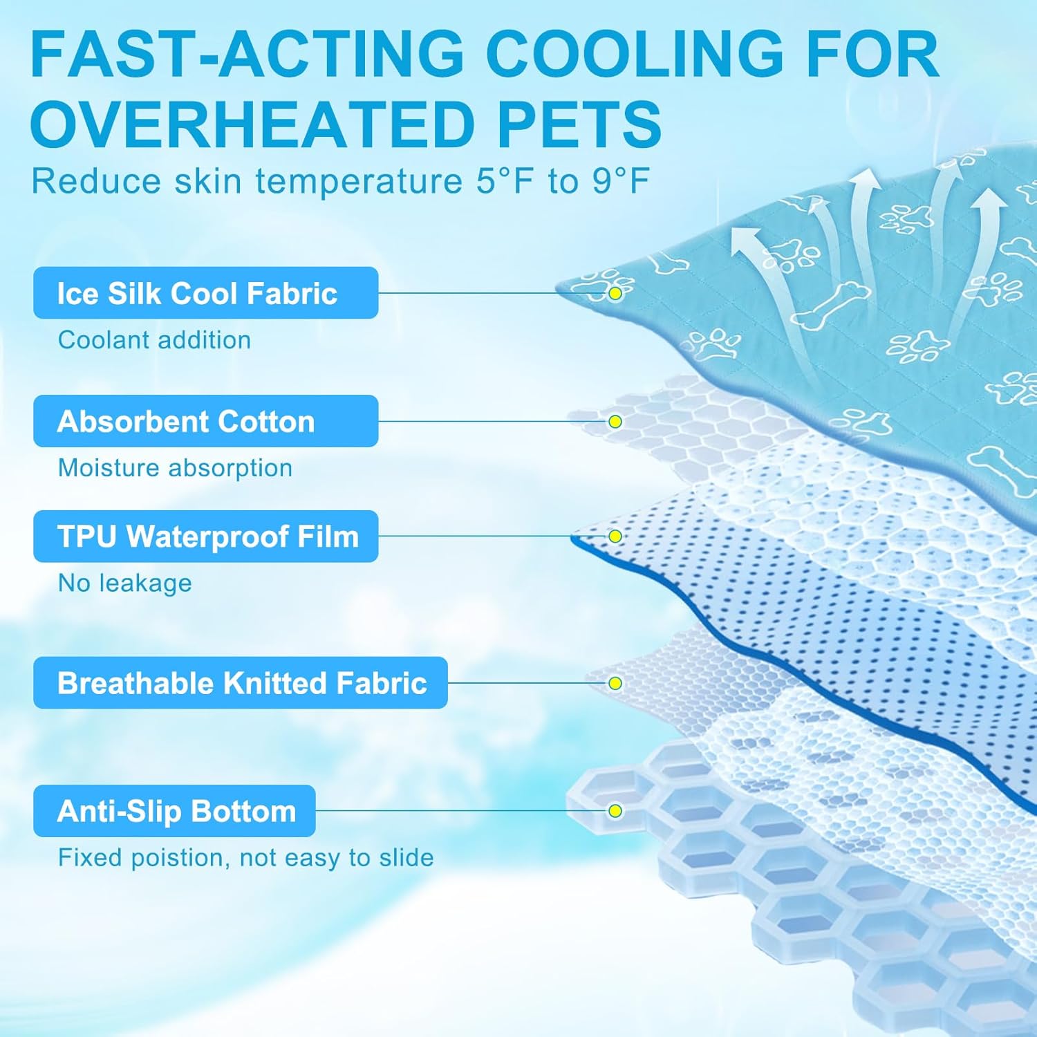 • Anti - slip & Easy Clean-- Designed with non-slip dispensing bottom, prevent from sliding on the floor, also perfect for older animals, or those dealing with joint pain or recovering from surgery. Our pet cooling mat is machine washable, you don't need to spend a lot of time on pet fur and dander, just throw it to the washing machine.
