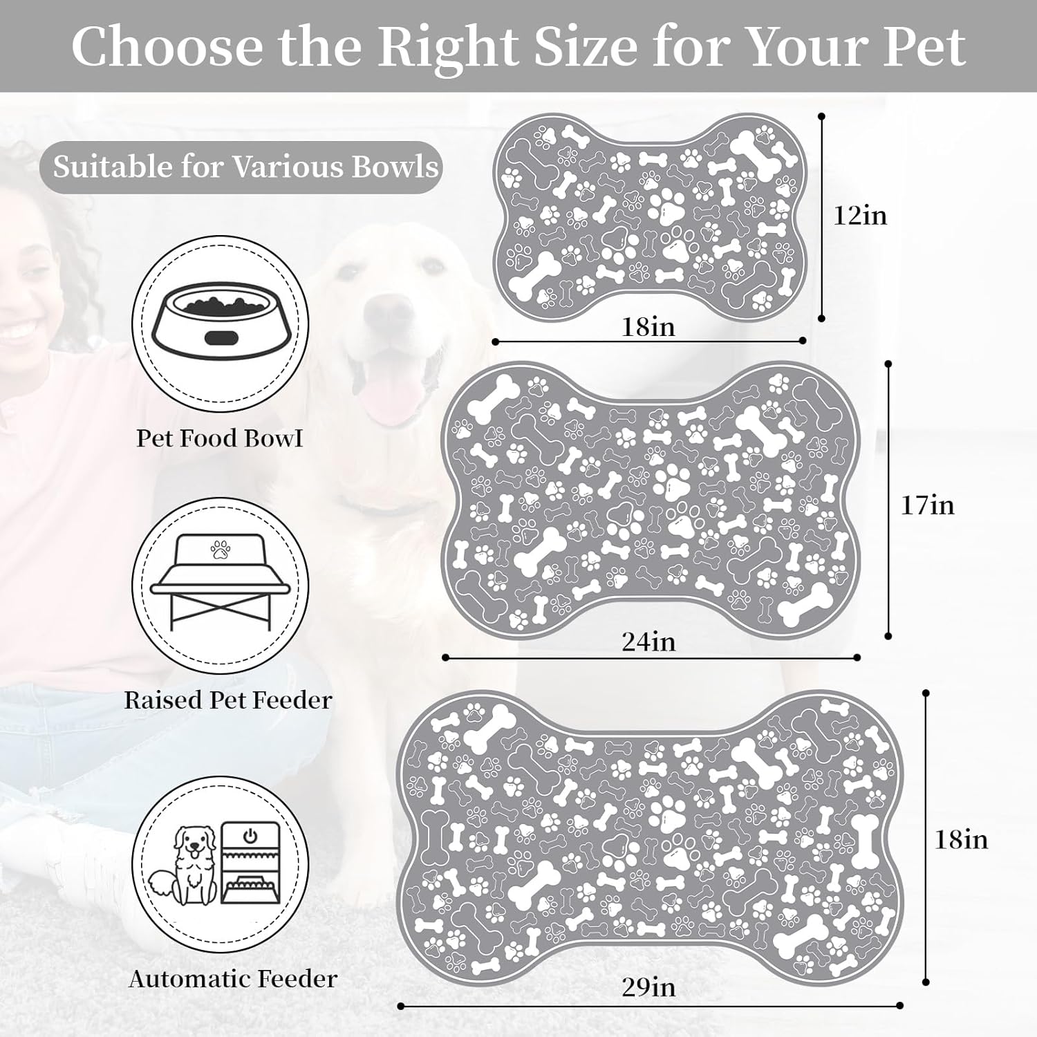 • CUTE AND FASHIONABLE DESIGN: Our pet feeding mats are designed with dog paw and bone motifs, very interesting. It is available in a variety of colors, sizes and shapes to provide a unique dedicated space for your pet's food and water bowls, and you can choose a style that matches your home décor.