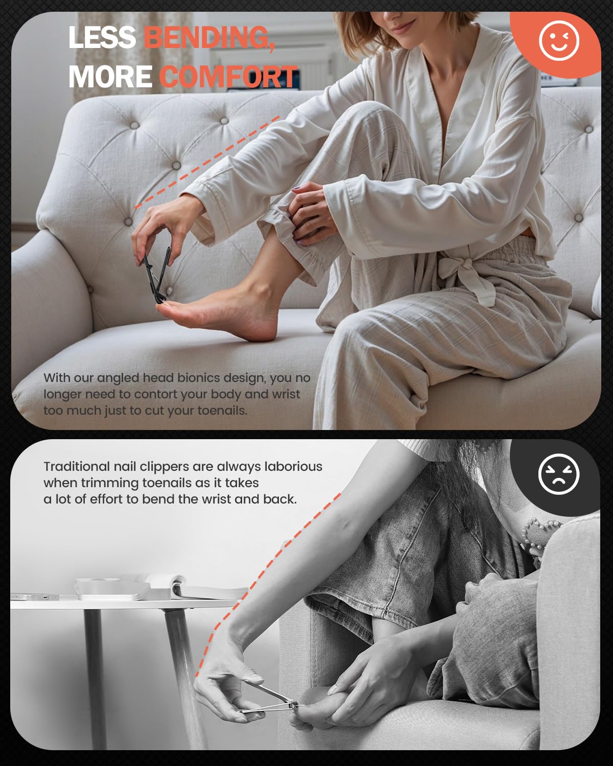 • LESS BENDING, MORE COMFORT - We understand the importance of comfort and convenience, especially for elderly individuals. Our ergonomic toenails clipper for seniors fits comfortably in your hand, ensuring a secure grip and reducing strain on your wrist. With this thick nails clipper's innovative angled head bionics design, you no longer need to contort your body just to cut your toenails.