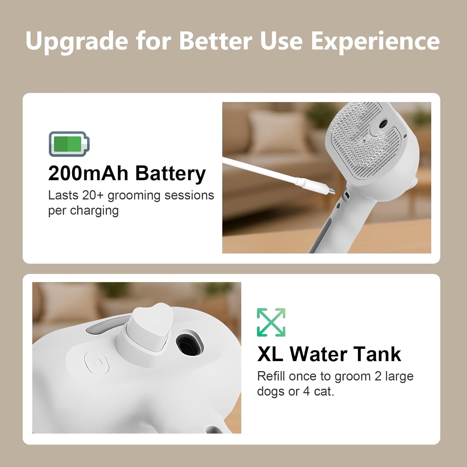 • ‌Cool/Warm Mist Customization‌--Add room-temperature or warm water to the brush—‌no heating function‌. The mist adjusts to your water’s temperature to soothe skin, reduce static, and detangle fur. Mix with your favorite pet conditioner for extra shine!