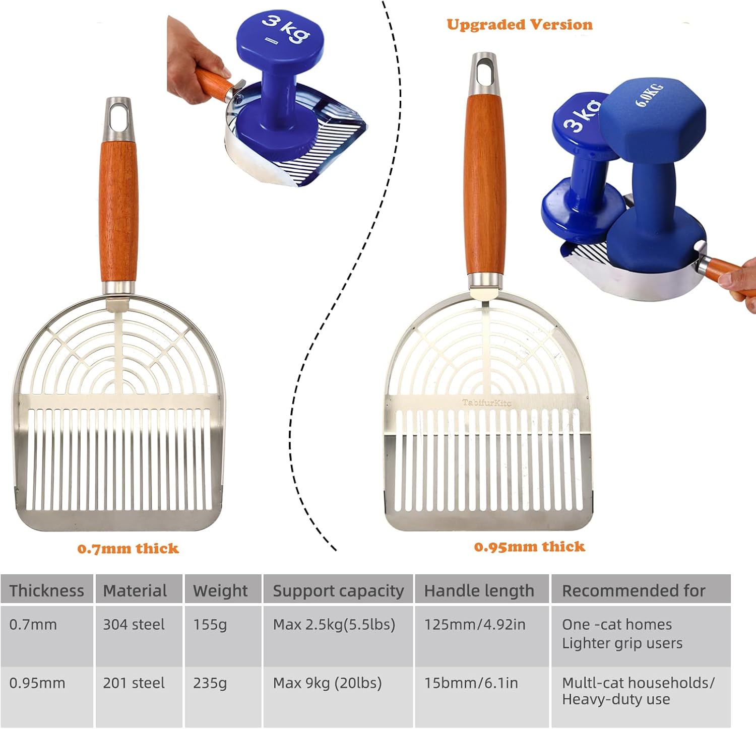 • [Upgraded to 0.95mm Thick ] This is a TabifurKitc custom-built heavy duty metal cat litter scoop, upgraded from 0.7mm to 0.95mm in thickness. Made from 201 stainless steel, this durable poop scooper supports up to 9kg (20 lbs) of clumping litter. Reinforced welds eliminate cracking or snapping, making it perfect for multi-cat households or anyone needing a litter box scooper that handles weight with ease.